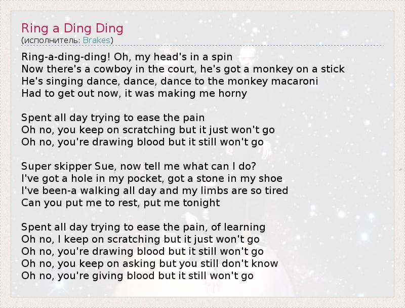 Ring-a-ding-ding! Oh, my head's in a spin Now there's a cowboy in the court, he's got a monkey on a stick He's singing dance, dance, dance to the monkey macaroni Had to get out now, it was making me horny Spent all day trying to ease the pain Oh no, you keep on scratching but it just won't go Oh no, you're drawing blood but it still won't go Super skipper Sue, now tell me what can I do? I've got a hole in my pocket, got a stone in my shoe I've been-a walking all day and my limbs are so tired Can you put me to rest, put me tonight Spent all day trying to ease the pain, of learning Oh no, I keep on scratching but it just won't go Oh no, you're drawing blood but it still won't go Oh no, you keep on asking but you still don't know Oh no, you're giving blood but it still won't go