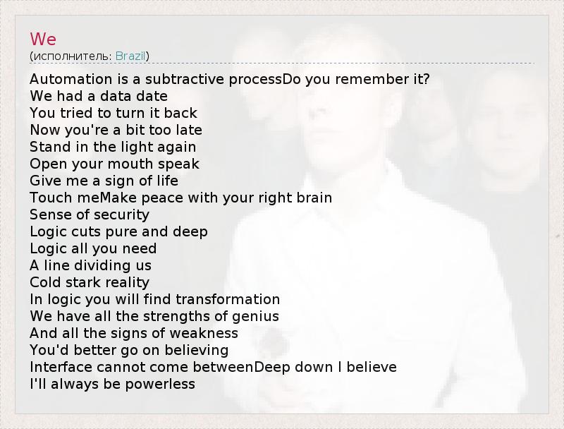 Это интересно:Группа образовалась около 2000 года в США, г. Манси (штат Индиана). В составе: Ник и Джонатон Ньюби, Арон Смит, Мэтт Миллер, Эрик Джонсон и Скотт Фримен. Секстет записал серию демо (никогда не издававшийся The Lost EP) и начал околачивать пороги. Настойчивость быстро принесла плоды: Brazil заключила контракт с лейблом Fearless и осенью 2002 года выпустила EP Dasein. Амбициозная смесь постхардкорных воплей, экспериментальных... продолжение