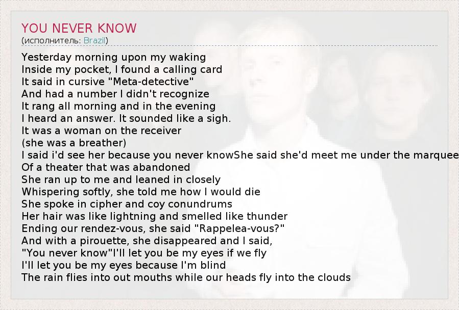 Yesterday morning upon my waking Inside my pocket, I found a calling card It said in cursive "Meta-detective" And had a number I didn't recognize It rang all morning and in the evening I heard an answer. It sounded like a sigh. It was a woman on the receiver (she was a breather) I said i'd see her because you never knowShe said she'd meet me under the marquee Of a theater that was abandoned She ran up to me and leaned in closely Whispering softly, she told me how I would die She spoke in cipher and coy conundrums Her hair was like lightning and smelled like thunder Ending our rendez-vous, she said "Rappelea-vous?" And with a pirouette, she disappeared and I said, "You never know"I'll let you be my eyes if we fly I'll let you be my eyes because I'm blind The rain flies into out mouths while our heads fly into the clouds