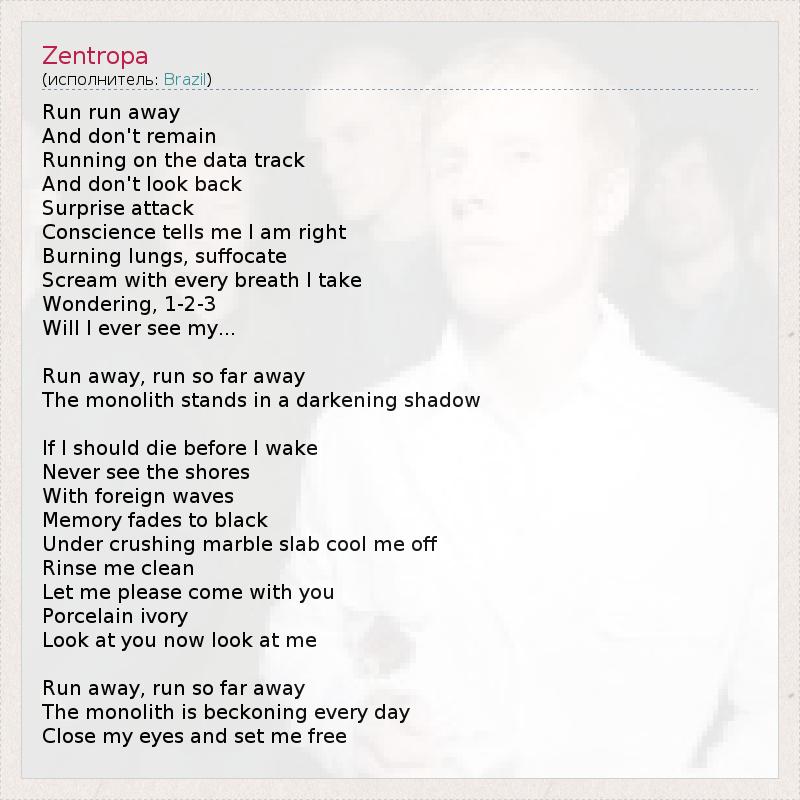 Run run away And don't remain Running on the data track And don't look back Surprise attack Conscience tells me I am right Burning lungs, suffocate Scream with every breath I take Wondering, 1-2-3 Will I ever see my... Run away, run so far away The monolith stands in a darkening shadow If I should die before I wake Never see the shores With foreign waves Memory fades to black Under crushing marble slab cool me off Rinse me clean Let me please come with you Porcelain ivory Look at you now look at me Run away, run so far away The monolith is beckoning every day Close my eyes and set me free