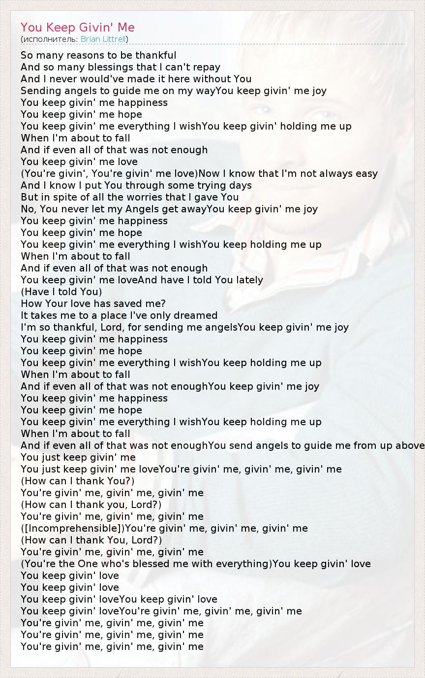 So many reasons to be thankful And so many blessings that I can't repay And I never would've made it here without You Sending angels to guide me on my wayYou keep givin' me joy You keep givin' me happiness You keep givin' me hope You keep givin' me everything I wishYou keep givin' holding me up When I'm about to fall And if even all of that was not enough You keep givin' me love (You're givin', You're givin' me love)Now I know that I'm not always easy And I know I put You through some trying days But in spite of all the worries that I gave You No, You never let my Angels get awayYou keep givin' me joy You keep givin' me happiness You keep givin' me hope You keep givin' me everything I wishYou keep holding me up When I'm about to fall And if even all of that was not enough You keep givin' me loveAnd have I told You lately (Have I told You) How Your love has saved me? It takes me to a place I've only dreamed I'm so thankful, Lord, for sending me angelsYou keep givin' me joy You keep givin' me happiness You keep givin' me hope You keep givin' me everything I wishYou keep holding me up When I'm about to fall And if even all of that was not enoughYou keep givin' me joy You keep givin' me happiness You keep givin' me hope You keep givin' me everything I wishYou keep holding me up When I'm about to fall And if even all of that was not enoughYou send angels to guide me from up above You just keep givin' me You just keep givin' me loveYou're givin' me, givin' me, givin' me (How can I thank You?) You're givin' me, givin' me, givin' me (How can I thank you, Lord?) You're givin' me, givin' me, givin' me ([Incomprehensible])You're givin' me, givin' me, givin' me (How can I thank You, Lord?) You're givin' me, givin' me, givin' me (You're the One who's blessed me with everything)You keep givin' love You keep givin' love You keep givin' love You keep givin' loveYou keep givin' love You keep givin' loveYou're givin' me, givin' me, givin' me You're givin' me, givin' me, givin' me You're givin' me, givin' me, givin' me You're givin' me, givin' me, givin' me