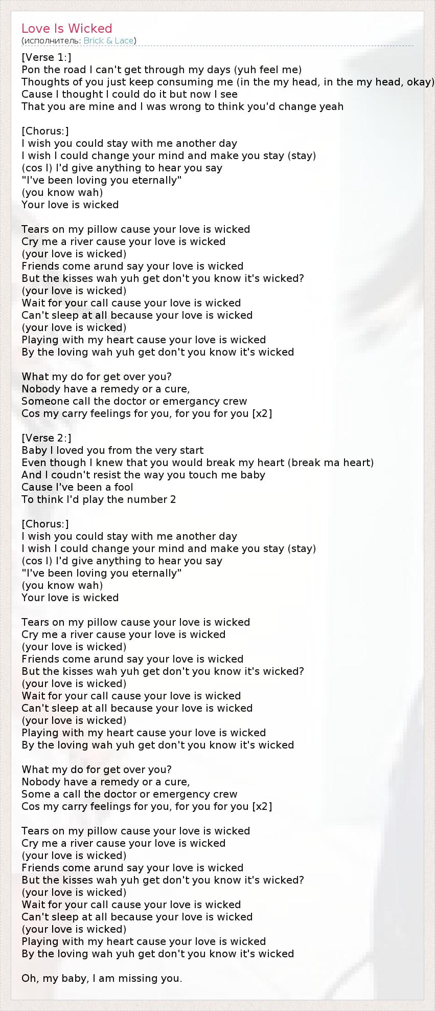 [Verse 1:] Pon the road I can't get through my days (yuh feel me) Thoughts of you just keep consuming me (in the my head, in the my head, okay) Cause I thought I could do it but now I see That you are mine and I was wrong to think you'd change yeah [Chorus:] I wish you could stay with me another day I wish I could change your mind and make you stay (stay) (cos I) I'd give anything to hear you say "I've been loving you eternally" (you know wah) Your love is wicked Tears on my pillow cause your love is wicked Cry me a river cause your love is wicked (your love is wicked) Friends come arund say your love is wicked But the kisses wah yuh get don't you know it's wicked? (your love is wicked) Wait for your call cause your love is wicked Can't sleep at all because your love is wicked (your love is wicked) Playing with my heart cause your love is wicked By the loving wah yuh get don't you know it's wicked What my do for get over you? Nobody have a remedy or a cure, Someone call the doctor or emergancy crew Cos my carry feelings for you, for you for you [x2] [Verse 2:] Baby I loved you from the very start Even though I knew that you would break my heart (break ma heart) And I coudn't resist the way you touch me baby Cause I've been a fool To think I'd play the number 2 [Chorus:] I wish you could stay with me another day I wish I could change your mind and make you stay (stay) (cos I) I'd give anything to hear you say "I've been loving you eternally" (you know wah) Your love is wicked Tears on my pillow cause your love is wicked Cry me a river cause your love is wicked (your love is wicked) Friends come arund say your love is wicked But the kisses wah yuh get don't you know it's wicked? (your love is wicked) Wait for your call cause your love is wicked Can't sleep at all because your love is wicked (your love is wicked) Playing with my heart cause your love is wicked By the loving wah yuh get don't you know it's wicked What my do for get over you? Nobody have a remedy or a cure, Some a call the doctor or emergency crew Cos my carry feelings for you, for you for you [x2] Tears on my pillow cause your love is wicked Cry me a river cause your love is wicked (your love is wicked) Friends come arund say your love is wicked But the kisses wah yuh get don't you know it's wicked? (your love is wicked) Wait for your call cause your love is wicked Can't sleep at all because your love is wicked (your love is wicked) Playing with my heart cause your love is wicked By the loving wah yuh get don't you know it's wicked Oh, my baby, I am missing you.