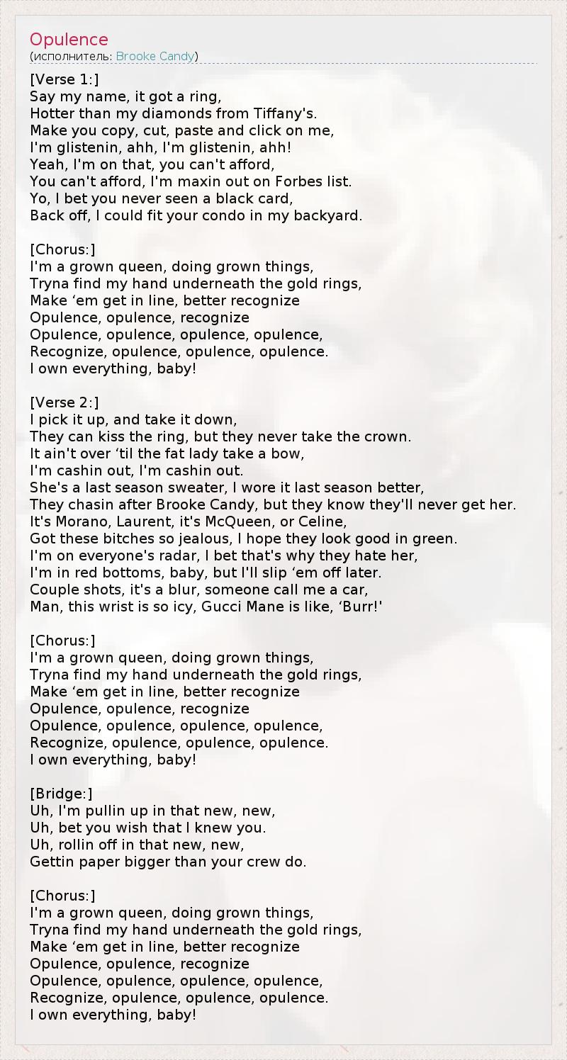 [Verse 1:] Say my name, it got a ring, Hotter than my diamonds from Tiffany's. Make you copy, cut, paste and click on me, I'm glistenin, ahh, I'm glistenin, ahh! Yeah, I'm on that, you can't afford, You can't afford, I'm maxin out on Forbes list. Yo, I bet you never seen a black card, Back off, I could fit your condo in my backyard. [Chorus:] I'm a grown queen, doing grown things, Tryna find my hand underneath the gold rings, Make ‘em get in line, better recognize Opulence, opulence, recognize Opulence, opulence, opulence, opulence, Recognize, opulence, opulence, opulence. I own everything, baby! [Verse 2:] I pick it up, and take it down, They can kiss the ring, but they never take the crown. It ain't over ‘til the fat lady take a bow, I'm cashin out, I'm cashin out. She's a last season sweater, I wore it last season better, They chasin after Brooke Candy, but they know they'll never get her. It's Morano, Laurent, it's McQueen, or Celine, Got these bitches so jealous, I hope they look good in green. I'm on everyone's radar, I bet that's why they hate her, I'm in red bottoms, baby, but I'll slip ‘em off later. Couple shots, it's a blur, someone call me a car, Man, this wrist is so icy, Gucci Mane is like, ‘Burr!' [Chorus:] I'm a grown queen, doing grown things, Tryna find my hand underneath the gold rings, Make ‘em get in line, better recognize Opulence, opulence, recognize Opulence, opulence, opulence, opulence, Recognize, opulence, opulence, opulence. I own everything, baby! [Bridge:] Uh, I'm pullin up in that new, new, Uh, bet you wish that I knew you. Uh, rollin off in that new, new, Gettin paper bigger than your crew do. [Chorus:] I'm a grown queen, doing grown things, Tryna find my hand underneath the gold rings, Make ‘em get in line, better recognize Opulence, opulence, recognize Opulence, opulence, opulence, opulence, Recognize, opulence, opulence, opulence. I own everything, baby!