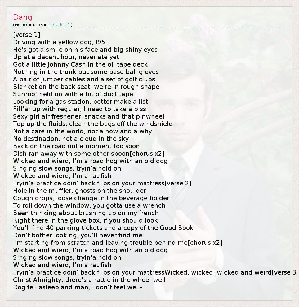 [verse 1] Driving with a yellow dog, I95 He's got a smile on his face and big shiny eyes Up at a decent hour, never ate yet Got a little Johnny Cash in the ol' tape deck Nothing in the trunk but some base ball gloves A pair of jumper cables and a set of golf clubs Blanket on the back seat, we're in rough shape Sunroof held on with a bit of duct tape Looking for a gas station, better make a list Fill'er up with regular, I need to take a piss Sexy girl air freshener, snacks and that pinwheel Top up the fluids, clean the bugs off the windshield Not a care in the world, not a how and a why No destination, not a cloud in the sky Back on the road not a moment too soon Dish ran away with some other spoon[chorus x2] Wicked and wierd, I'm a road hog with an old dog Singing slow songs, tryin'a hold on Wicked and wierd, I'm a rat fish Tryin'a practice doin' back flips on your mattress[verse 2] Hole in the muffler, ghosts on the shoulder Cough drops, loose change in the beverage holder To roll down the window, you gotta use a wrench Been thinking about brushing up on my french Right there in the glove box, if you should look You'll find 40 parking tickets and a copy of the Good Book Don't bother looking, you'll never find me I'm starting from scratch and leaving trouble behind me[chorus x2] Wicked and wierd, I'm a road hog with an old dog Singing slow songs, tryin'a hold on Wicked and wierd, I'm a rat fish Tryin'a practice doin' back flips on your mattressWicked, wicked, wicked and weird[verse 3] Christ Almighty, there's a rattle in the wheel well Dog fell asleep and man, I don't feel well-