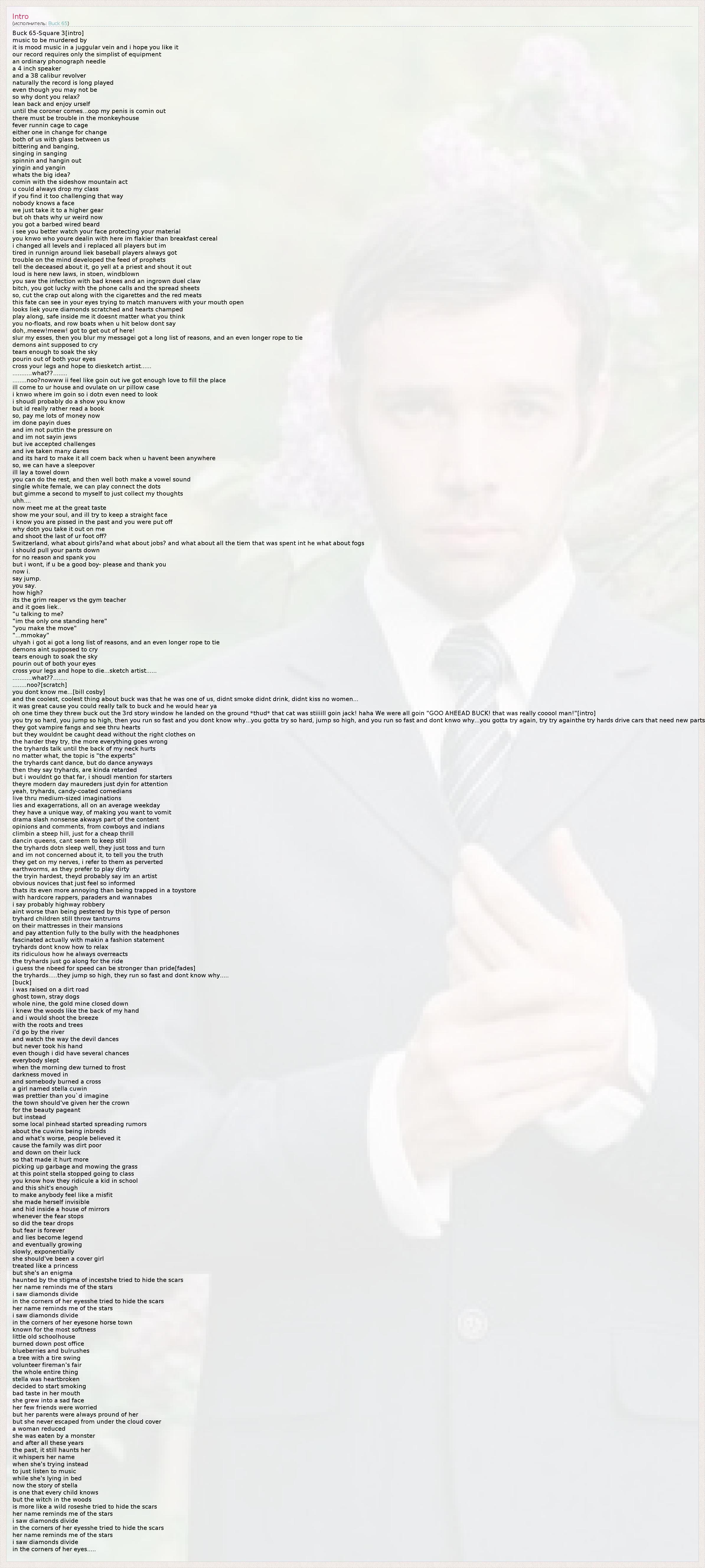 oh one time they threw buck out the 3rd story window he landed on the ground *thud* that cat was stiiiill goin jack! haha We were all goin "GOO AHEEAD BUCK! that was really cooool man!"[intro]
