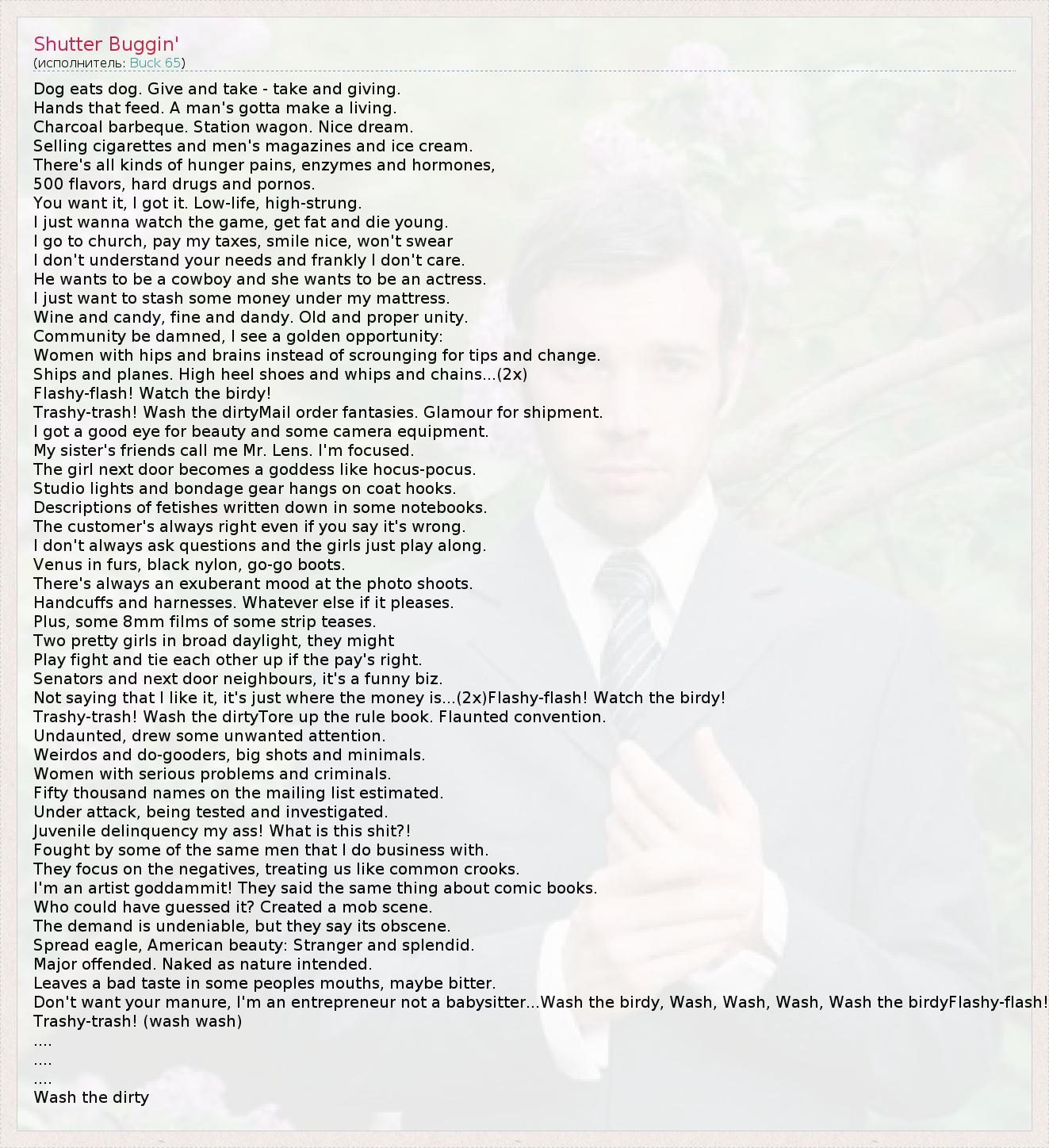 Это интересно:Richard Terfry (родился 4 марта 1972-го года), более известный под именем Buck 65 - легенда канадского хип-хопа. Его роль в развитии современной хип-хоп музыки сложно переоценить. Он стал одним из создетелей современного альтернативного и экспериментального хип-хопа. К тому же его эксперименты уходят далеко за пределы хип-хопа. Он экспериментирует с блюзом, кантри, роком, фолком и авангардом.Детство... продолжение