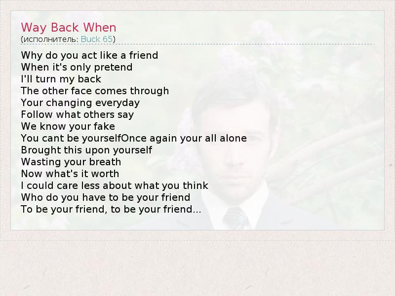 Why do you act like a friend When it's only pretend I'll turn my back The other face comes through Your changing everyday Follow what others say We know your fake You cant be yourselfOnce again your all alone Brought this upon yourself Wasting your breath Now what's it worth I could care less about what you think Who do you have to be your friend To be your friend, to be your friend...