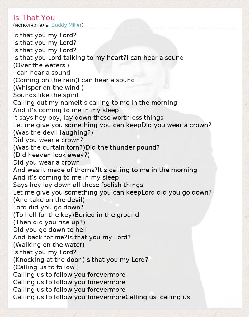 Is that you my Lord? Is that you my Lord? Is that you my Lord? Is that you Lord talking to my heart?I can hear a sound (Over the waters ) I can hear a sound (Coming on the rain)I can hear a sound (Whisper on the wind ) Sounds like the spirit Calling out my nameIt's calling to me in the morning And it's coming to me in my sleep It says hey boy, lay down these worthless things Let me give you something you can keepDid you wear a crown? (Was the devil laughing?) Did you wear a crown? (Was the curtain torn?)Did the thunder pound? (Did heaven look away?) Did you wear a crown And was it made of thorns?It's calling to me in the morning And it's coming to me in my sleep Says hey lay down all these foolish things Let me give you something you can keepLord did you go down? (And take on the devil) Lord did you go down? (To hell for the key)Buried in the ground (Then did you rise up?) Did you go down to hell And back for me?Is that you my Lord? (Walking on the water) Is that you my Lord? (Knocking at the door )Is that you my Lord? (Calling us to follow ) Calling us to follow you forevermore Calling us to follow you forevermore Calling us to follow you forevermore Calling us to follow you forevermoreCalling us, calling us
