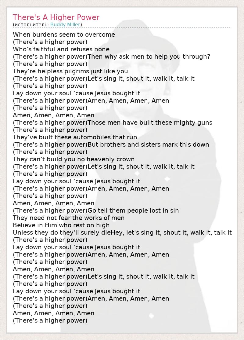 When burdens seem to overcome (There's a higher power) Who's faithful and refuses none (There's a higher power)Then why ask men to help you through? (There's a higher power) They're helpless pilgrims just like you (There's a higher power)Let's sing it, shout it, walk it, talk it (There's a higher power) Lay down your soul 'cause Jesus bought it (There's a higher power)Amen, Amen, Amen, Amen (There's a higher power) Amen, Amen, Amen, Amen (There's a higher power)Those men have built these mighty guns (There's a higher power) They've built these automobiles that run (There's a higher power)But brothers and sisters mark this down (There's a higher power) They can't build you no heavenly crown (There's a higher power)Let's sing it, shout it, walk it, talk it (There's a higher power) Lay down your soul 'cause Jesus bought it (There's a higher power)Amen, Amen, Amen, Amen (There's a higher power) Amen, Amen, Amen, Amen (There's a higher power)Go tell them people lost in sin They need not fear the works of men Believe in Him who rest on high Unless they do they'll surely dieHey, let's sing it, shout it, walk it, talk it (There's a higher power) Lay down your soul 'cause Jesus bought it (There's a higher power)Amen, Amen, Amen, Amen (There's a higher power) Amen, Amen, Amen, Amen (There's a higher power)Let's sing it, shout it, walk it, talk it (There's a higher power) Lay down your soul 'cause Jesus bought it (There's a higher power)Amen, Amen, Amen, Amen (There's a higher power) Amen, Amen, Amen, Amen (There's a higher power)