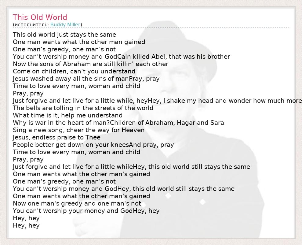 This old world just stays the same One man wants what the other man gained One man's greedy, one man's not You can't worship money and GodCain killed Abel, that was his brother Now the sons of Abraham are still killin' each other Come on children, can't you understand Jesus washed away all the sins of manPray, pray Time to love every man, woman and child Pray, pray Just forgive and let live for a little while, heyHey, I shake my head and wonder how much more The bells are tolling in the streets of the world What time is it, help me understand Why is war in the heart of man?Children of Abraham, Hagar and Sara Sing a new song, cheer the way for Heaven Jesus, endless praise to Thee People better get down on your kneesAnd pray, pray Time to love every man, woman and child Pray, pray Just forgive and let live for a little whileHey, this old world still stays the same One man wants what the other man's gained One man's greedy, one man's not You can't worship money and GodHey, this old world still stays the same One man wants what the other man's gained Now one man's greedy and one man's not You can't worship your money and GodHey, hey Hey, hey Hey, hey