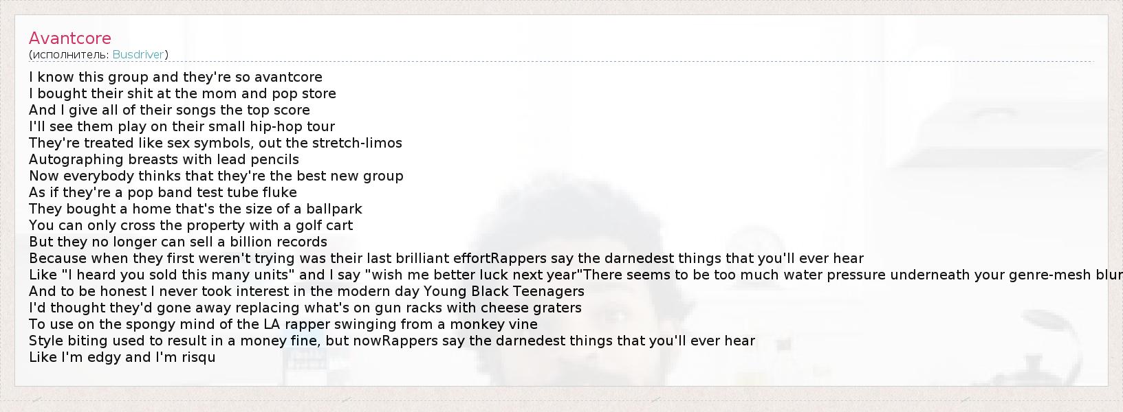 I know this group and they're so avantcore I bought their shit at the mom and pop store And I give all of their songs the top score I'll see them play on their small hip-hop tour They're treated like sex symbols, out the stretch-limos Autographing breasts with lead pencils Now everybody thinks that they're the best new group As if they're a pop band test tube fluke They bought a home that's the size of a ballpark You can only cross the property with a golf cart But they no longer can sell a billion records Because when they first weren't trying was their last brilliant effortRappers say the darnedest things that you'll ever hear Like "I heard you sold this many units" and I say "wish me better luck next year"There seems to be too much water pressure underneath your genre-mesh blur And to be honest I never took interest in the modern day Young Black Teenagers I'd thought they'd gone away replacing what's on gun racks with cheese graters To use on the spongy mind of the LA rapper swinging from a monkey vine Style biting used to result in a money fine, but nowRappers say the darnedest things that you'll ever hear Like I'm edgy and I'm risqu