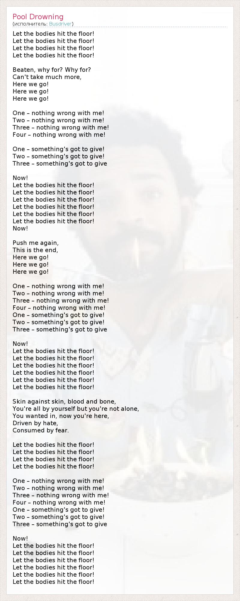 Let the bodies hit the floor! Let the bodies hit the floor! Let the bodies hit the floor! Let the bodies hit the floor! Beaten, why for? Why for? Can't take much more, Here we go! Here we go! Here we go! One – nothing wrong with me! Two – nothing wrong with me! Three – nothing wrong with me! Four – nothing wrong with me! One – something's got to give! Two – something's got to give! Three – something's got to give Now! Let the bodies hit the floor! Let the bodies hit the floor! Let the bodies hit the floor! Let the bodies hit the floor! Let the bodies hit the floor! Let the bodies hit the floor! Now! Push me again, This is the end, Here we go! Here we go! Here we go! One – nothing wrong with me! Two – nothing wrong with me! Three – nothing wrong with me! Four – nothing wrong with me! One – something's got to give! Two – something's got to give! Three – something's got to give Now! Let the bodies hit the floor! Let the bodies hit the floor! Let the bodies hit the floor! Let the bodies hit the floor! Let the bodies hit the floor! Let the bodies hit the floor! Skin against skin, blood and bone, You're all by yourself but you're not alone, You wanted in, now you're here, Driven by hate, Consumed by fear. Let the bodies hit the floor! Let the bodies hit the floor! Let the bodies hit the floor! Let the bodies hit the floor! One – nothing wrong with me! Two – nothing wrong with me! Three – nothing wrong with me! Four – nothing wrong with me! One – something's got to give! Two – something's got to give! Three – something's got to give Now! Let the bodies hit the floor! Let the bodies hit the floor! Let the bodies hit the floor! Let the bodies hit the floor! Let the bodies hit the floor! Let the bodies hit the floor!
