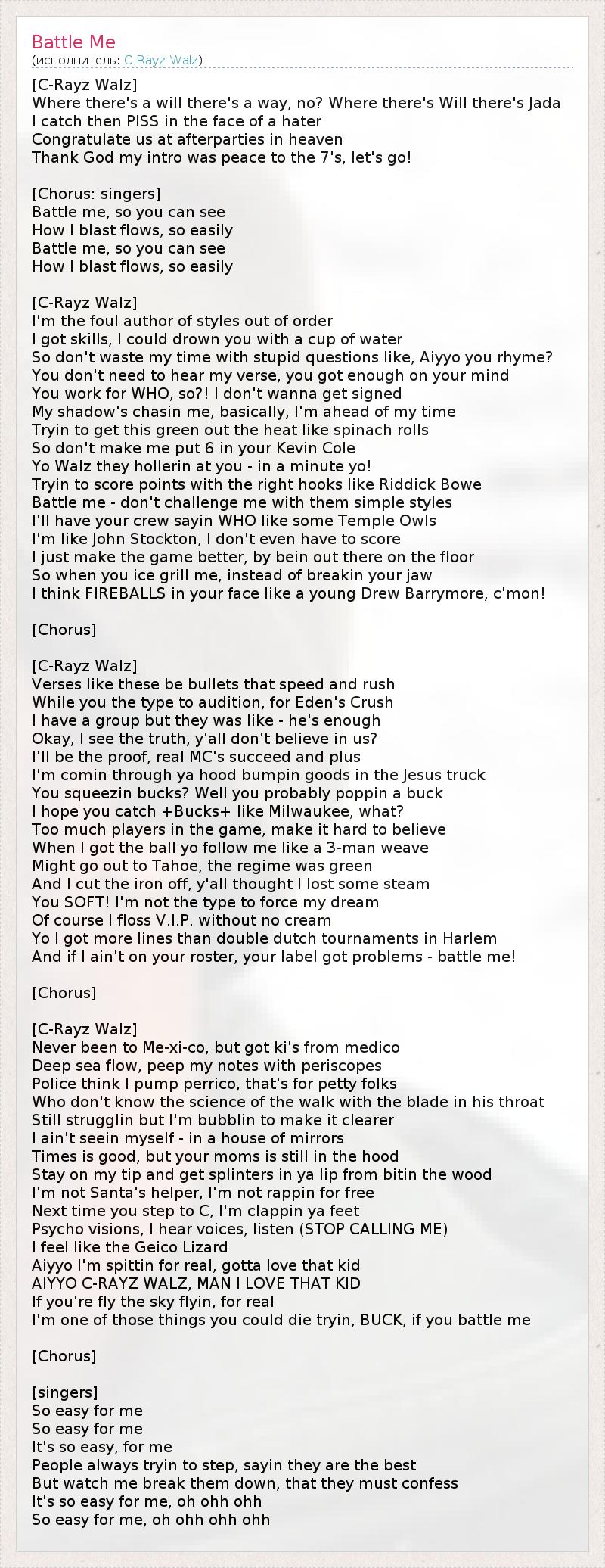 [C-Rayz Walz] Where there's a will there's a way, no? Where there's Will there's Jada I catch then PISS in the face of a hater Congratulate us at afterparties in heaven Thank God my intro was peace to the 7's, let's go! [Chorus: singers] Battle me, so you can see How I blast flows, so easily Battle me, so you can see How I blast flows, so easily [C-Rayz Walz] I'm the foul author of styles out of order I got skills, I could drown you with a cup of water So don't waste my time with stupid questions like, Aiyyo you rhyme? You don't need to hear my verse, you got enough on your mind You work for WHO, so?! I don't wanna get signed My shadow's chasin me, basically, I'm ahead of my time Tryin to get this green out the heat like spinach rolls So don't make me put 6 in your Kevin Cole Yo Walz they hollerin at you - in a minute yo! Tryin to score points with the right hooks like Riddick Bowe Battle me - don't challenge me with them simple styles I'll have your crew sayin WHO like some Temple Owls I'm like John Stockton, I don't even have to score I just make the game better, by bein out there on the floor So when you ice grill me, instead of breakin your jaw I think FIREBALLS in your face like a young Drew Barrymore, c'mon! [Chorus] [C-Rayz Walz] Verses like these be bullets that speed and rush While you the type to audition, for Eden's Crush I have a group but they was like - he's enough Okay, I see the truth, y'all don't believe in us? I'll be the proof, real MC's succeed and plus I'm comin through ya hood bumpin goods in the Jesus truck You squeezin bucks? Well you probably poppin a buck I hope you catch +Bucks+ like Milwaukee, what? Too much players in the game, make it hard to believe When I got the ball yo follow me like a 3-man weave Might go out to Tahoe, the regime was green And I cut the iron off, y'all thought I lost some steam You SOFT! I'm not the type to force my dream Of course I floss V.I.P. without no cream Yo I got more lines than double dutch tournaments in Harlem And if I ain't on your roster, your label got problems - battle me! [Chorus] [C-Rayz Walz] Never been to Me-xi-co, but got ki's from medico Deep sea flow, peep my notes with periscopes Police think I pump perrico, that's for petty folks Who don't know the science of the walk with the blade in his throat Still strugglin but I'm bubblin to make it clearer I ain't seein myself - in a house of mirrors Times is good, but your moms is still in the hood Stay on my tip and get splinters in ya lip from bitin the wood I'm not Santa's helper, I'm not rappin for free Next time you step to C, I'm clappin ya feet Psycho visions, I hear voices, listen (STOP CALLING ME) I feel like the Geico Lizard Aiyyo I'm spittin for real, gotta love that kid AIYYO C-RAYZ WALZ, MAN I LOVE THAT KID If you're fly the sky flyin, for real I'm one of those things you could die tryin, BUCK, if you battle me [Chorus] [singers] So easy for me So easy for me It's so easy, for me People always tryin to step, sayin they are the best But watch me break them down, that they must confess It's so easy for me, oh ohh ohh So easy for me, oh ohh ohh ohh