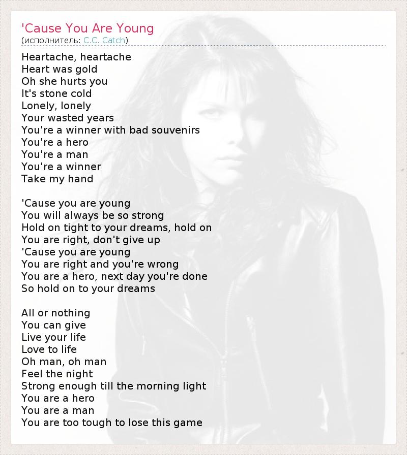 Страдание, страдание... Сердце было золотым. О, она ранит тебя, Это холодный камень. Одинокий, одинокий... Твои растраченные годы - Ты победитель с жалкой наградой. Ты – герой, Ты – мужчина, Ты – победитель. Пожми мою руку. Потому что ты молод, Ты всегда будешь сильным. Держись за свои мечты, Ты прав, не сдавайся. Потому что ты молод, Ты прав и не прав. Ты герой, а на следующий день - с тобой покончено, Поэтому следуй своей мечте. Всё или ничего Ты можешь отдать. Проживай свою жизнь, Люби жизнь. О, человек, Чувствуй ночью Достаточно силы до рассвета. Ты – герой, Ты – мужчина, Ты слишком силён, чтобы проиграть.