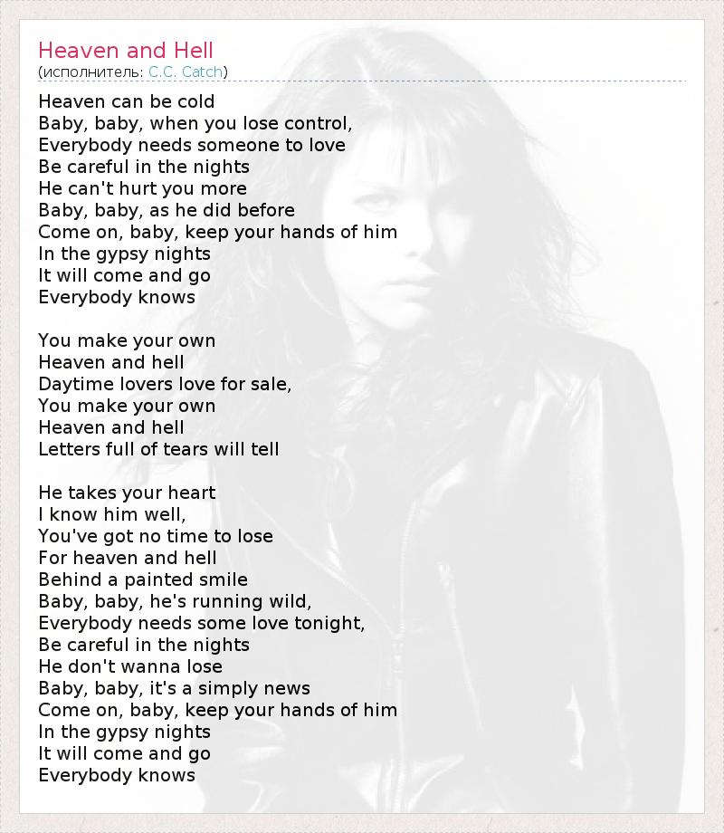 Heaven can be cold Baby, baby, when you lose control, Everybody needs someone to love Be careful in the nights He can't hurt you more Baby, baby, as he did before Come on, baby, keep your hands of him In the gypsy nights It will come and go Everybody knows You make your own Heaven and hell Daytime lovers love for sale, You make your own Heaven and hell Letters full of tears will tell He takes your heart I know him well, You've got no time to lose For heaven and hell Behind a painted smile Baby, baby, he's running wild, Everybody needs some love tonight, Be careful in the nights He don't wanna lose Baby, baby, it's a simply news Come on, baby, keep your hands of him In the gypsy nights It will come and go Everybody knows