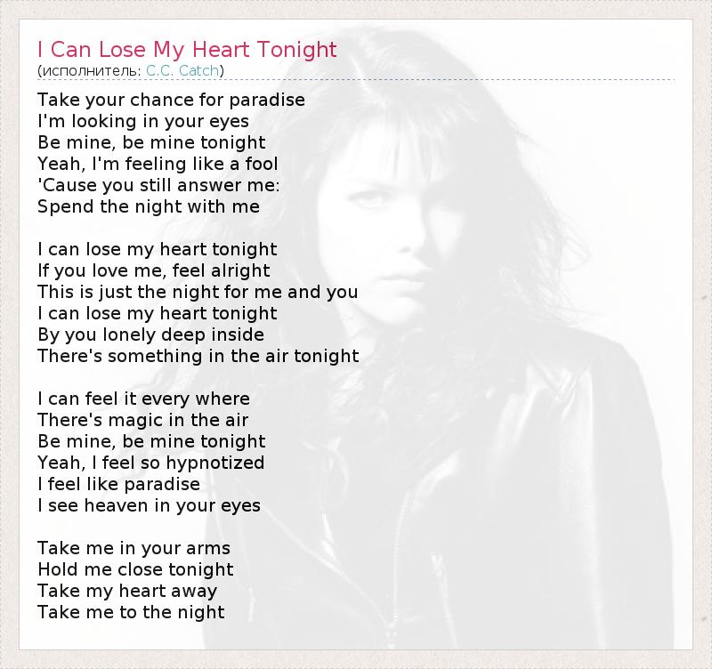 Используй свой шанс на рай. Я смотрю в твои глаза - Будь моим, будь моим сегодня. Да, я чувствую себя глупо, Потому что ты всё же отвечаешь мне: «Проведи со мной ночь». Я могу потерять сердце этой ночью, Если ты любишь меня, всё в порядке. Это ночь только для нас, Я могу потерять сердце этой ночью, Но ты очень одинок в глубине души... Что-то есть в воздухе этой ночью. Я чувствую это всюду - Волшебство в воздухе. Будь моим, будь моим сегодня. Да, я загипнотизирована, Я как в раю, Я вижу небо в твоих глазах. Обними меня, Держи меня крепче, Забери моё сердце, Уведи меня в ночь...