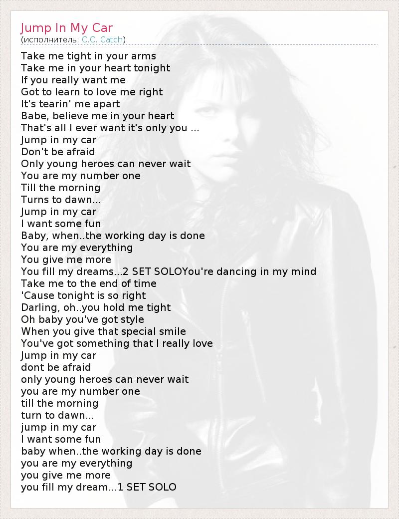 Take me tight in your arms Take me in your heart tonight If you really want me Got to learn to love me right It's tearin' me apart Babe, believe me in your heart That's all I ever want it's only you ... Jump in my car Don't be afraid Only young heroes can never wait You are my number one Till the morning Turns to dawn... Jump in my car I want some fun Baby, when..the working day is done You are my everything You give me more You fill my dreams...2 SET SOLOYou're dancing in my mind Take me to the end of time 'Cause tonight is so right Darling, oh..you hold me tight Oh baby you've got style When you give that special smile You've got something that I really love Jump in my car dont be afraid only young heroes can never wait you are my number one till the morning turn to dawn... jump in my car I want some fun baby when..the working day is done you are my everything you give me more you fill my dream...1 SET SOLO