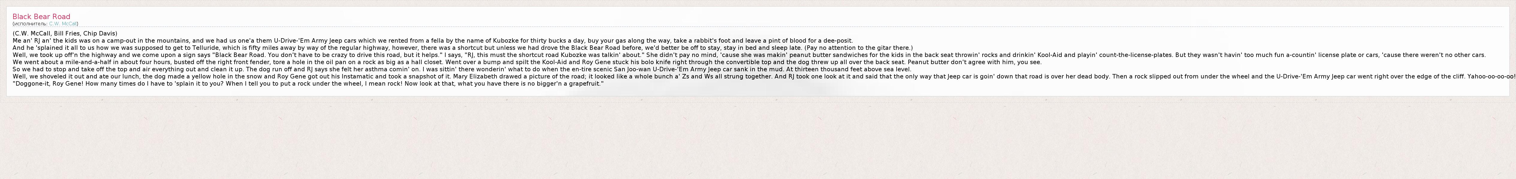 Well, we took up off'n the highway and we come upon a sign says "Black Bear Road. You don't have to be crazy to drive this road, but it helps." I says, "RJ, this must the shortcut road Kubozke was talkin' about." She didn't pay no mind, 'cause she was makin' peanut butter sandwiches for the kids in the back seat throwin' rocks and drinkin' Kool-Aid and playin' count-the-license-plates. But they wasn't havin' too much fun a-countin' license plate or cars, 'cause there weren't no other cars.