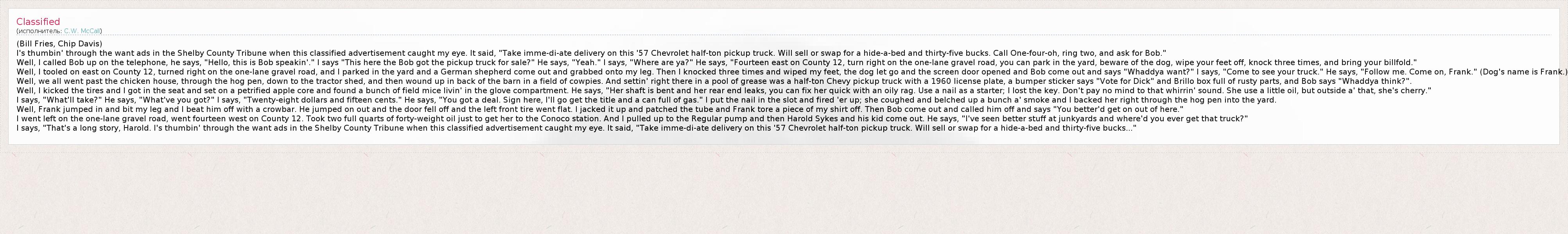 I's thumbin' through the want ads in the Shelby County Tribune when this classified advertisement caught my eye. It said, "Take imme-di-ate delivery on this '57 Chevrolet half-ton pickup truck. Will sell or swap for a hide-a-bed and thirty-five bucks. Call One-four-oh, ring two, and ask for Bob."