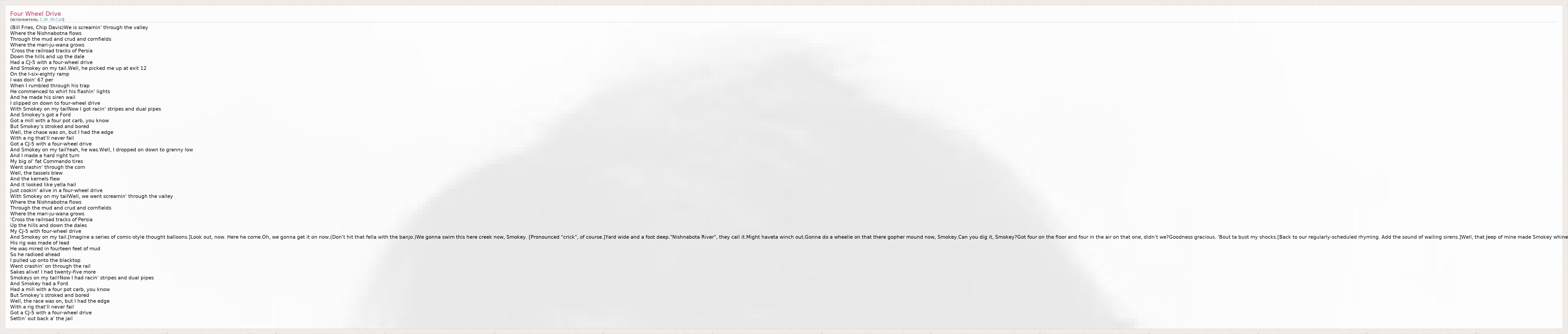 And Smokey on my tail.[Imagine a series of comic-style thought balloons.]Look out, now. Here he come.Oh, we gonna get it on now.(Don't hit that fella with the banjo.)We gonna swim this here creek now, Smokey. [Pronounced "crick", of course.]Yard wide and a foot deep."Nishnabota River", they call it.Might haveta winch out.Gonna do a wheelie on that there gopher mound now, Smokey.Can you dig it, Smokey?Got four on the floor and four in the air on that one, didn't we?Goodness gracious. 'Bout ta bust my shocks.[Back to our regularly-scheduled rhyming. Add the sound of wailing sirens.]Well, that Jeep of mine made Smokey whine