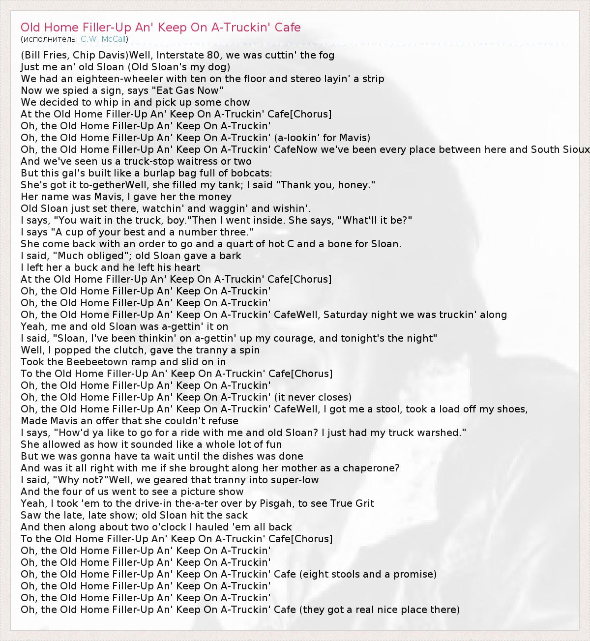 ГлавнаяИсполнителиC.W. McCallOld Home Filler-Up An' Keep On A-Truckin' Cafe