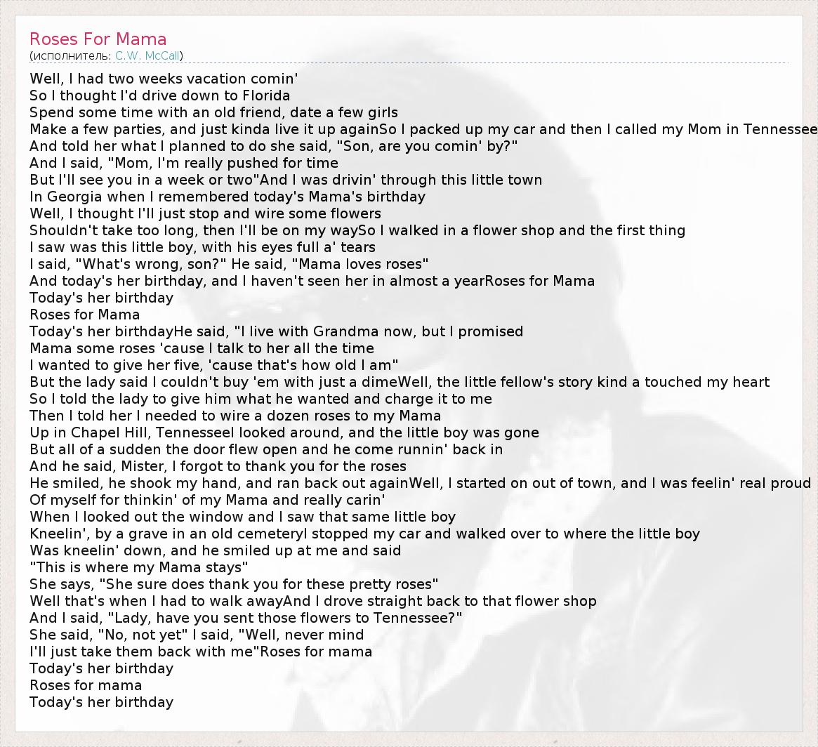 А как ты думаешь, о чем песня "Roses For Mama" ?