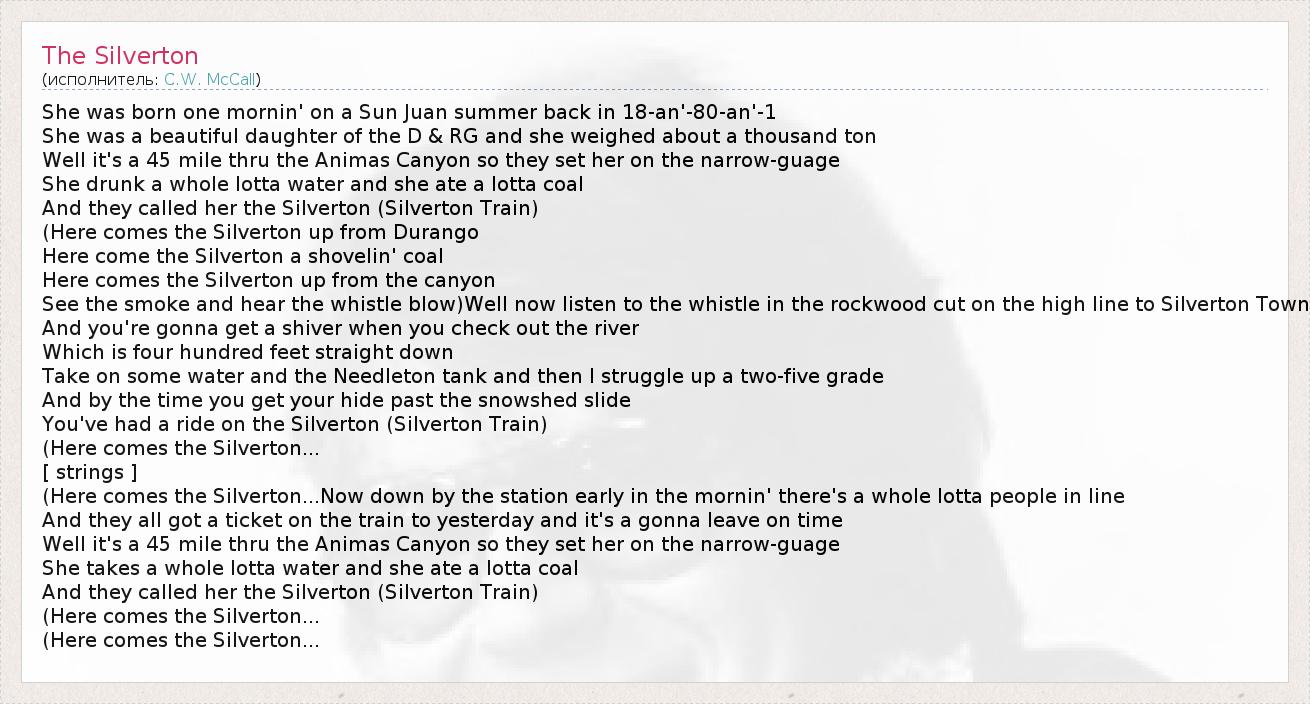 She was born one mornin' on a Sun Juan summer back in 18-an'-80-an'-1 She was a beautiful daughter of the D & RG and she weighed about a thousand ton Well it's a 45 mile thru the Animas Canyon so they set her on the narrow-guage She drunk a whole lotta water and she ate a lotta coal And they called her the Silverton (Silverton Train) (Here comes the Silverton up from Durango Here come the Silverton a shovelin' coal Here comes the Silverton up from the canyon See the smoke and hear the whistle blow)Well now listen to the whistle in the rockwood cut on the high line to Silverton Town And you're gonna get a shiver when you check out the river Which is four hundred feet straight down Take on some water and the Needleton tank and then I struggle up a two-five grade And by the time you get your hide past the snowshed slide You've had a ride on the Silverton (Silverton Train) (Here comes the Silverton... [ strings ] (Here comes the Silverton...Now down by the station early in the mornin' there's a whole lotta people in line And they all got a ticket on the train to yesterday and it's a gonna leave on time Well it's a 45 mile thru the Animas Canyon so they set her on the narrow-guage She takes a whole lotta water and she ate a lotta coal And they called her the Silverton (Silverton Train) (Here comes the Silverton... (Here comes the Silverton...