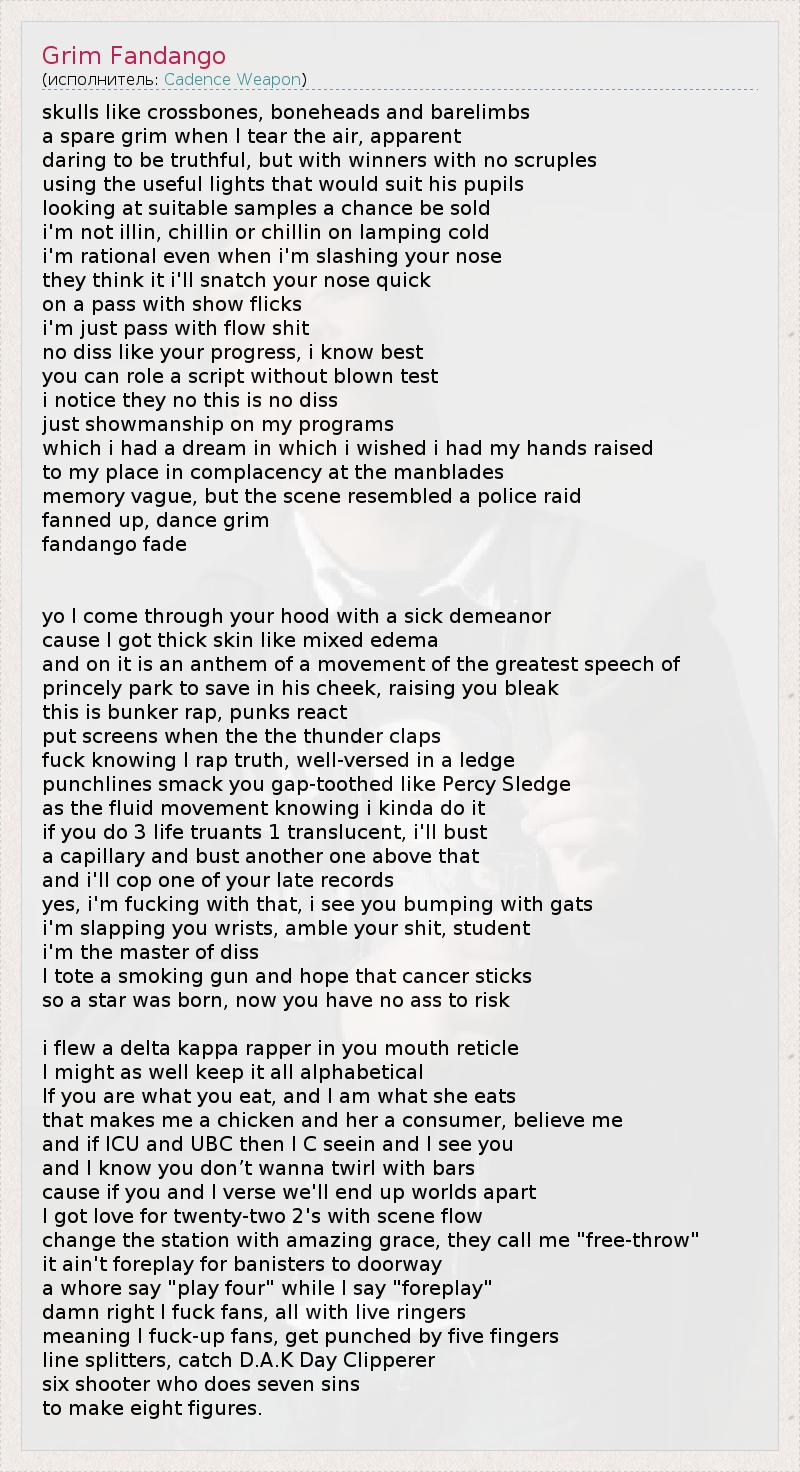 skulls like crossbones, boneheads and barelimbs a spare grim when I tear the air, apparent daring to be truthful, but with winners with no scruples using the useful lights that would suit his pupils looking at suitable samples a chance be sold i'm not illin, chillin or chillin on lamping cold i'm rational even when i'm slashing your nose they think it i'll snatch your nose quick on a pass with show flicks i'm just pass with flow shit no diss like your progress, i know best you can role a script without blown test i notice they no this is no diss just showmanship on my programs which i had a dream in which i wished i had my hands raised to my place in complacency at the manblades memory vague, but the scene resembled a police raid fanned up, dance grim fandango fade yo I come through your hood with a sick demeanor cause I got thick skin like mixed edema and on it is an anthem of a movement of the greatest speech of princely park to save in his cheek, raising you bleak this is bunker rap, punks react put screens when the the thunder claps fuck knowing I rap truth, well-versed in a ledge punchlines smack you gap-toothed like Percy Sledge as the fluid movement knowing i kinda do it if you do 3 life truants 1 translucent, i'll bust a capillary and bust another one above that and i'll cop one of your late records yes, i'm fucking with that, i see you bumping with gats i'm slapping you wrists, amble your shit, student i'm the master of diss I tote a smoking gun and hope that cancer sticks so a star was born, now you have no ass to risk i flew a delta kappa rapper in you mouth reticle I might as well keep it all alphabetical If you are what you eat, and I am what she eats that makes me a chicken and her a consumer, believe me and if ICU and UBC then I C seein and I see you and I know you don’t wanna twirl with bars cause if you and I verse we'll end up worlds apart I got love for twenty-two 2's with scene flow change the station with amazing grace, they call me "free-throw" it ain't foreplay for banisters to doorway a whore say "play four" while I say "foreplay" damn right I fuck fans, all with live ringers meaning I fuck-up fans, get punched by five fingers line splitters, catch D.A.K Day Clipperer six shooter who does seven sins to make eight figures.
