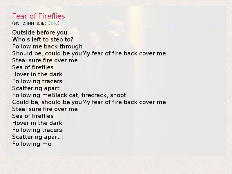Outside before you Who's left to step to? Follow me back through Should be, could be youMy fear of fire back cover me Steal sure fire over me Sea of fireflies Hover in the dark Following tracers Scattering apart Following meBlack cat, firecrack, shoot Could be, should be youMy fear of fire back cover me Steal sure fire over me Sea of fireflies Hover in the dark Following tracers Scattering apart Following me