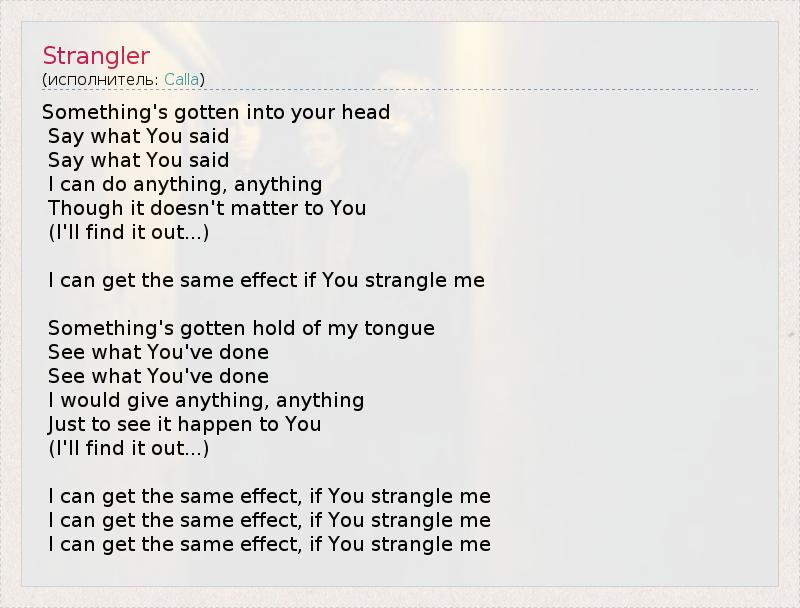 Something's gotten into your head Say what You said Say what You said I can do anything, anything Though it doesn't matter to You (I'll find it out...) I can get the same effect if You strangle me Something's gotten hold of my tongue See what You've done See what You've done I would give anything, anything Just to see it happen to You (I'll find it out...) I can get the same effect, if You strangle me I can get the same effect, if You strangle me I can get the same effect, if You strangle me