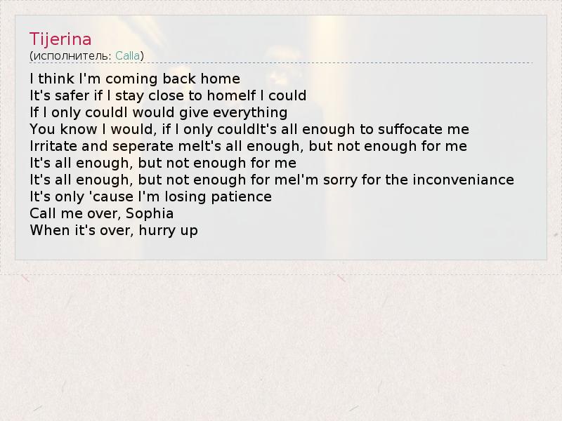 I think I'm coming back home It's safer if I stay close to homeIf I could If I only couldI would give everything You know I would, if I only couldIt's all enough to suffocate me Irritate and seperate meIt's all enough, but not enough for me It's all enough, but not enough for me It's all enough, but not enough for meI'm sorry for the inconveniance It's only 'cause I'm losing patience Call me over, Sophia When it's over, hurry up