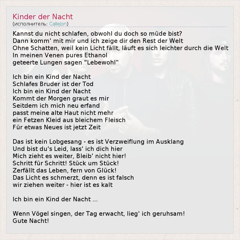 Kannst du nicht schlafen, obwohl du doch so müde bist? Dann komm' mit mir und ich zeige dir den Rest der Welt Ohne Schatten, weil kein Licht fällt, läuft es sich leichter durch die Welt In meinen Venen pures Ethanol geteerte Lungen sagen "Lebewohl" Ich bin ein Kind der Nacht Schlafes Bruder ist der Tod Ich bin ein Kind der Nacht Kommt der Morgen graut es mir Seitdem ich mich neu erfand passt meine alte Haut nicht mehr ein Fetzen Kleid aus bleichem Fleisch Für etwas Neues ist jetzt Zeit Das ist kein Lobgesang - es ist Verzweiflung im Ausklang Und bist du's Leid, lass' ich dich hier Mich zieht es weiter, Bleib' nicht hier! Schritt für Schritt! Stück um Stück! Zerfällt das Leben, fern von Glück! Das Licht es schmerzt, denn es ist falsch wir ziehen weiter - hier ist es kalt Ich bin ein Kind der Nacht ... Wenn Vögel singen, der Tag erwacht, lieg' ich geruhsam! Gute Nacht!