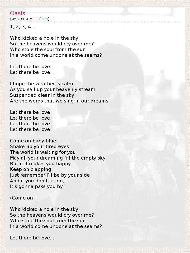 1, 2, 3, 4... Who kicked a hole in the sky So the heavens would cry over me? Who stole the soul from the sun In a world come undone at the seams? Let there be love Let there be love I hope the weather is calm As you sail up your heavenly stream. Suspended clear in the sky Are the words that we sing in our dreams. Let there be love Let there be love Let there be love Let there be love Come on baby blue Shake up your tired eyes The world is waiting for you May all your dreaming fill the empty sky. But if it makes you happy Keep on clapping Just remember I'll be by your side And if you don't let go, It's gonna pass you by. (Come on!) Who kicked a hole in the sky So the heavens would cry over me? Who stole the soul from the sun In a world come undone at the seams? Let there be love...