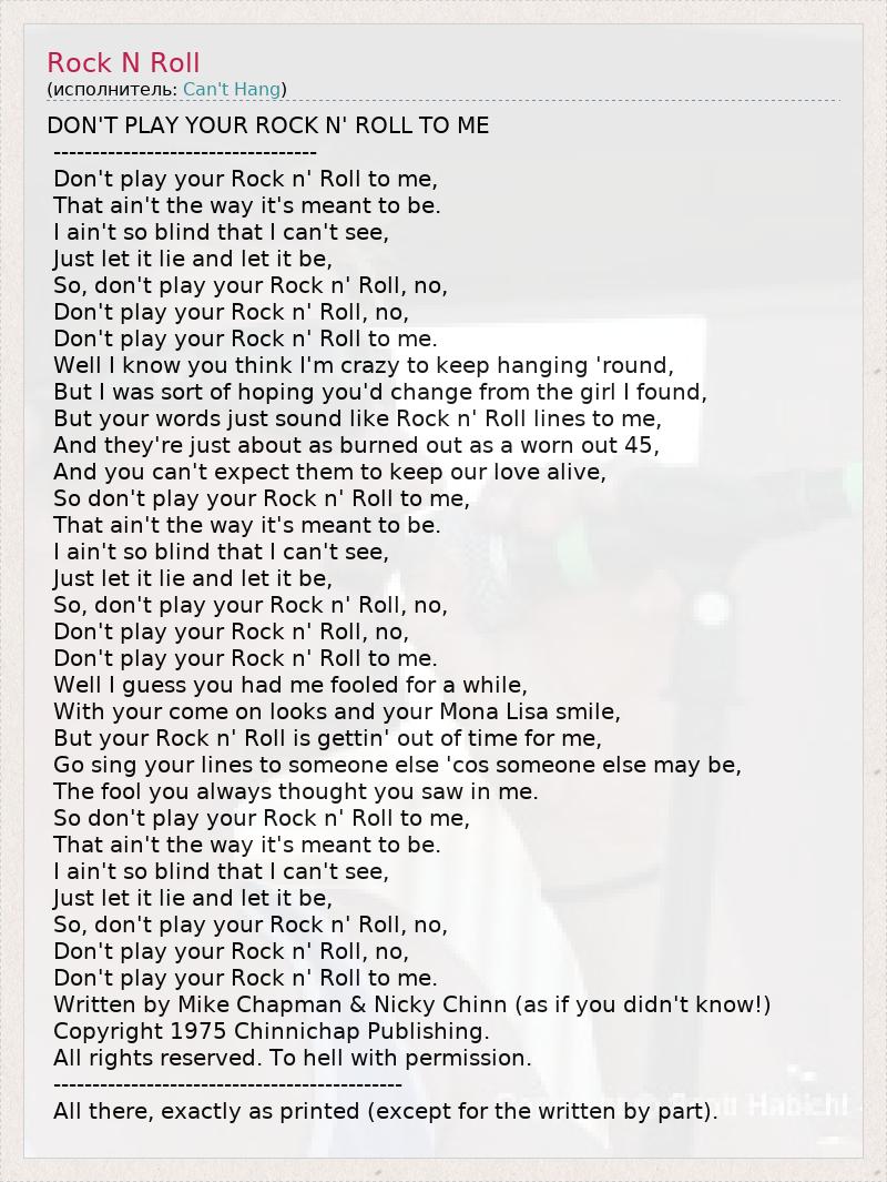 DON'T PLAY YOUR ROCK N' ROLL TO ME ---------------------------------- Don't play your Rock n' Roll to me, That ain't the way it's meant to be. I ain't so blind that I can't see, Just let it lie and let it be, So, don't play your Rock n' Roll, no, Don't play your Rock n' Roll, no, Don't play your Rock n' Roll to me. Well I know you think I'm crazy to keep hanging 'round, But I was sort of hoping you'd change from the girl I found, But your words just sound like Rock n' Roll lines to me, And they're just about as burned out as a worn out 45, And you can't expect them to keep our love alive, So don't play your Rock n' Roll to me, That ain't the way it's meant to be. I ain't so blind that I can't see, Just let it lie and let it be, So, don't play your Rock n' Roll, no, Don't play your Rock n' Roll, no, Don't play your Rock n' Roll to me. Well I guess you had me fooled for a while, With your come on looks and your Mona Lisa smile, But your Rock n' Roll is gettin' out of time for me, Go sing your lines to someone else 'cos someone else may be, The fool you always thought you saw in me. So don't play your Rock n' Roll to me, That ain't the way it's meant to be. I ain't so blind that I can't see, Just let it lie and let it be, So, don't play your Rock n' Roll, no, Don't play your Rock n' Roll, no, Don't play your Rock n' Roll to me. Written by Mike Chapman & Nicky Chinn (as if you didn't know!) Copyright 1975 Chinnichap Publishing. All rights reserved. To hell with permission. --------------------------------------------- All there, exactly as printed (except for the written by part).