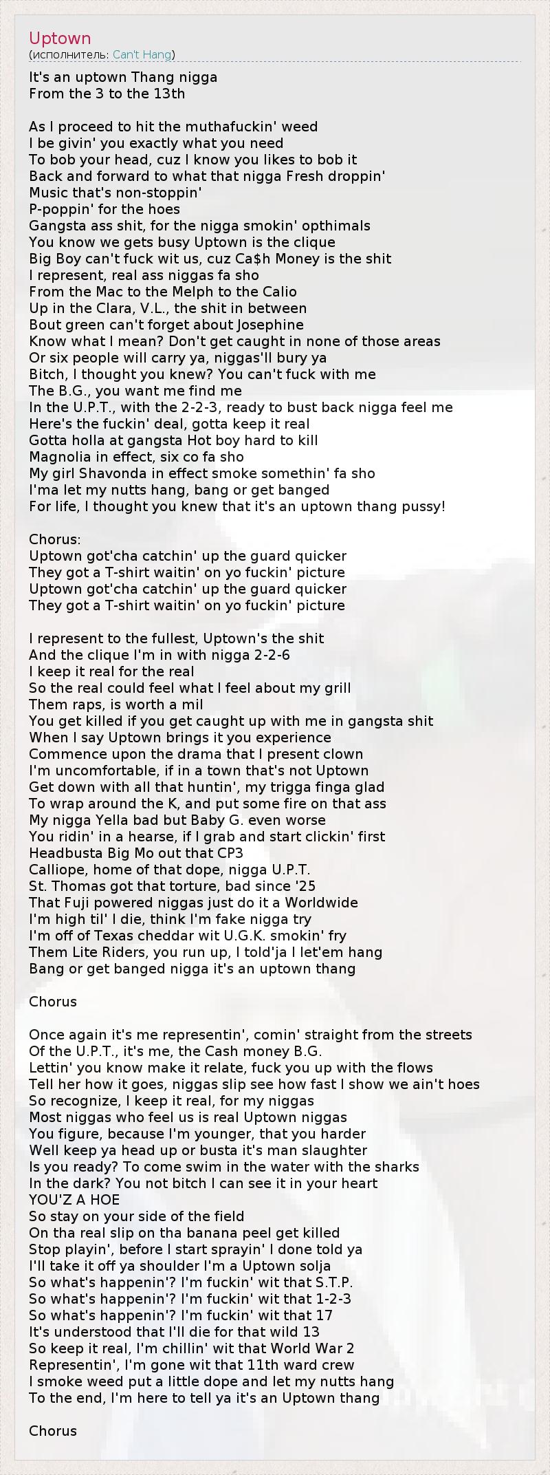 It's an uptown Thang nigga From the 3 to the 13th As I proceed to hit the muthafuckin' weed I be givin' you exactly what you need To bob your head, cuz I know you likes to bob it Back and forward to what that nigga Fresh droppin' Music that's non-stoppin' P-poppin' for the hoes Gangsta ass shit, for the nigga smokin' opthimals You know we gets busy Uptown is the clique Big Boy can't fuck wit us, cuz Ca$h Money is the shit I represent, real ass niggas fa sho From the Mac to the Melph to the Calio Up in the Clara, V.L., the shit in between Bout green can't forget about Josephine Know what I mean? Don't get caught in none of those areas Or six people will carry ya, niggas'll bury ya Bitch, I thought you knew? You can't fuck with me The B.G., you want me find me In the U.P.T., with the 2-2-3, ready to bust back nigga feel me Here's the fuckin' deal, gotta keep it real Gotta holla at gangsta Hot boy hard to kill Magnolia in effect, six co fa sho My girl Shavonda in effect smoke somethin' fa sho I'ma let my nutts hang, bang or get banged For life, I thought you knew that it's an uptown thang pussy! Chorus: Uptown got'cha catchin' up the guard quicker They got a T-shirt waitin' on yo fuckin' picture Uptown got'cha catchin' up the guard quicker They got a T-shirt waitin' on yo fuckin' picture I represent to the fullest, Uptown's the shit And the clique I'm in with nigga 2-2-6 I keep it real for the real So the real could feel what I feel about my grill Them raps, is worth a mil You get killed if you get caught up with me in gangsta shit When I say Uptown brings it you experience Commence upon the drama that I present clown I'm uncomfortable, if in a town that's not Uptown Get down with all that huntin', my trigga finga glad To wrap around the K, and put some fire on that ass My nigga Yella bad but Baby G. even worse You ridin' in a hearse, if I grab and start clickin' first Headbusta Big Mo out that CP3 Calliope, home of that dope, nigga U.P.T. St. Thomas got that torture, bad since '25 That Fuji powered niggas just do it a Worldwide I'm high til' I die, think I'm fake nigga try I'm off of Texas cheddar wit U.G.K. smokin' fry Them Lite Riders, you run up, I told'ja I let'em hang Bang or get banged nigga it's an uptown thang Chorus Once again it's me representin', comin' straight from the streets Of the U.P.T., it's me, the Cash money B.G. Lettin' you know make it relate, fuck you up with the flows Tell her how it goes, niggas slip see how fast I show we ain't hoes So recognize, I keep it real, for my niggas Most niggas who feel us is real Uptown niggas You figure, because I'm younger, that you harder Well keep ya head up or busta it's man slaughter Is you ready? To come swim in the water with the sharks In the dark? You not bitch I can see it in your heart YOU'Z A HOE So stay on your side of the field On tha real slip on tha banana peel get killed Stop playin', before I start sprayin' I done told ya I'll take it off ya shoulder I'm a Uptown solja So what's happenin'? I'm fuckin' wit that S.T.P. So what's happenin'? I'm fuckin' wit that 1-2-3 So what's happenin'? I'm fuckin' wit that 17 It's understood that I'll die for that wild 13 So keep it real, I'm chillin' wit that World War 2 Representin', I'm gone wit that 11th ward crew I smoke weed put a little dope and let my nutts hang To the end, I'm here to tell ya it's an Uptown thang Chorus