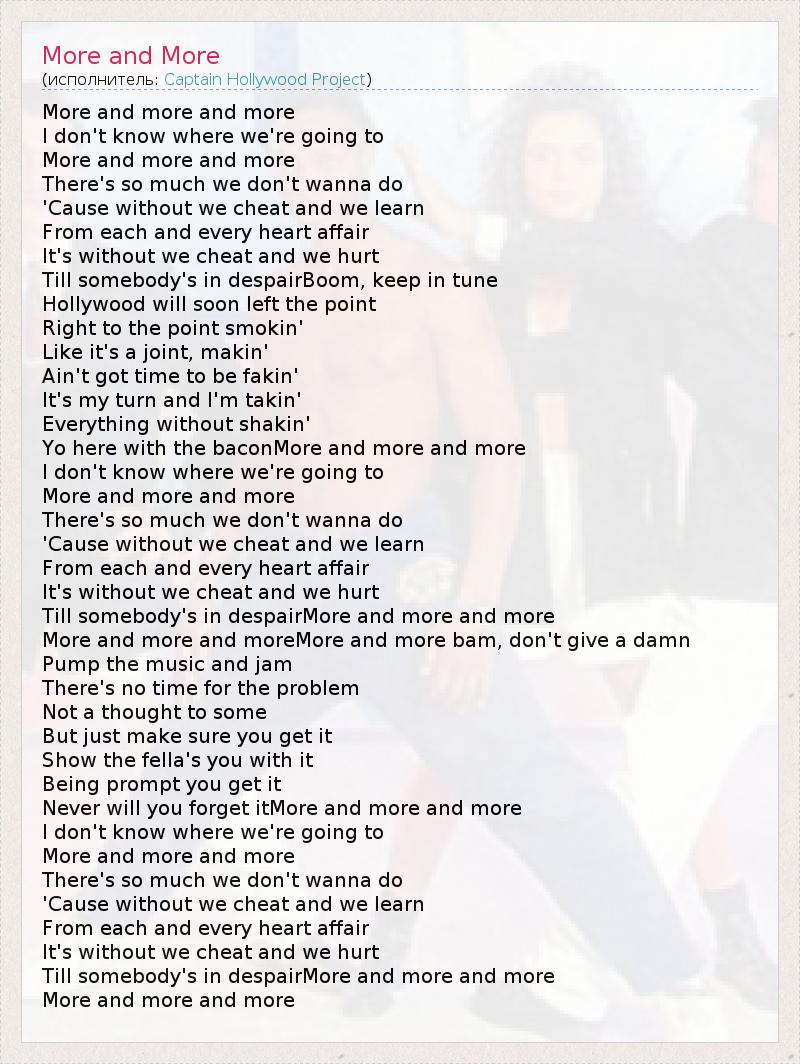 More and more and more I don't know where we're going to More and more and more There's so much we don't wanna do 'Cause without we cheat and we learn From each and every heart affair It's without we cheat and we hurt Till somebody's in despairBoom, keep in tune Hollywood will soon left the point Right to the point smokin' Like it's a joint, makin' Ain't got time to be fakin' It's my turn and I'm takin' Everything without shakin' Yo here with the baconMore and more and more I don't know where we're going to More and more and more There's so much we don't wanna do 'Cause without we cheat and we learn From each and every heart affair It's without we cheat and we hurt Till somebody's in despairMore and more and more More and more and moreMore and more bam, don't give a damn Pump the music and jam There's no time for the problem Not a thought to some But just make sure you get it Show the fella's you with it Being prompt you get it Never will you forget itMore and more and more I don't know where we're going to More and more and more There's so much we don't wanna do 'Cause without we cheat and we learn From each and every heart affair It's without we cheat and we hurt Till somebody's in despairMore and more and more More and more and more