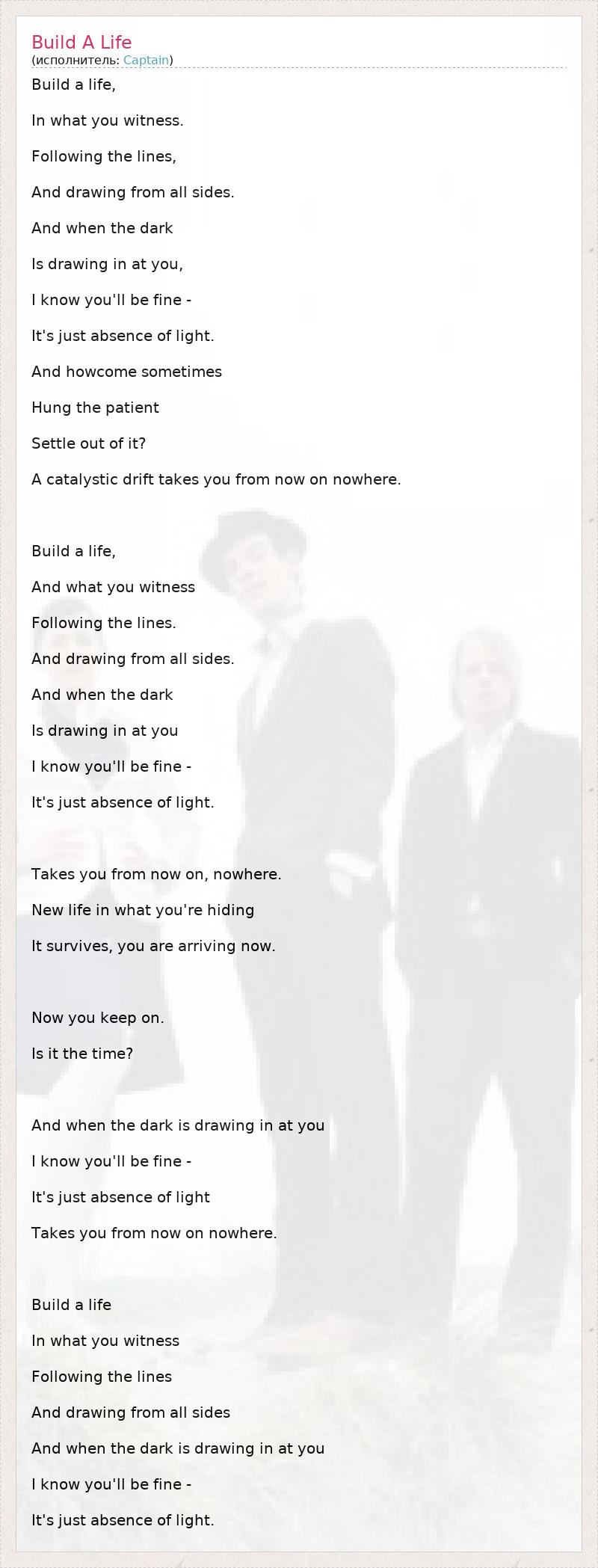 Build a life, In what you witness. Following the lines, And drawing from all sides. And when the dark Is drawing in at you, I know you'll be fine - It's just absence of light. And howcome sometimes Hung the patient Settle out of it? A catalystic drift takes you from now on nowhere. Build a life, And what you witness Following the lines. And drawing from all sides. And when the dark Is drawing in at you I know you'll be fine - It's just absence of light. Takes you from now on, nowhere. New life in what you're hiding It survives, you are arriving now. Now you keep on. Is it the time? And when the dark is drawing in at you I know you'll be fine - It's just absence of light Takes you from now on nowhere. Build a life In what you witness Following the lines And drawing from all sides And when the dark is drawing in at you I know you'll be fine - It's just absence of light.