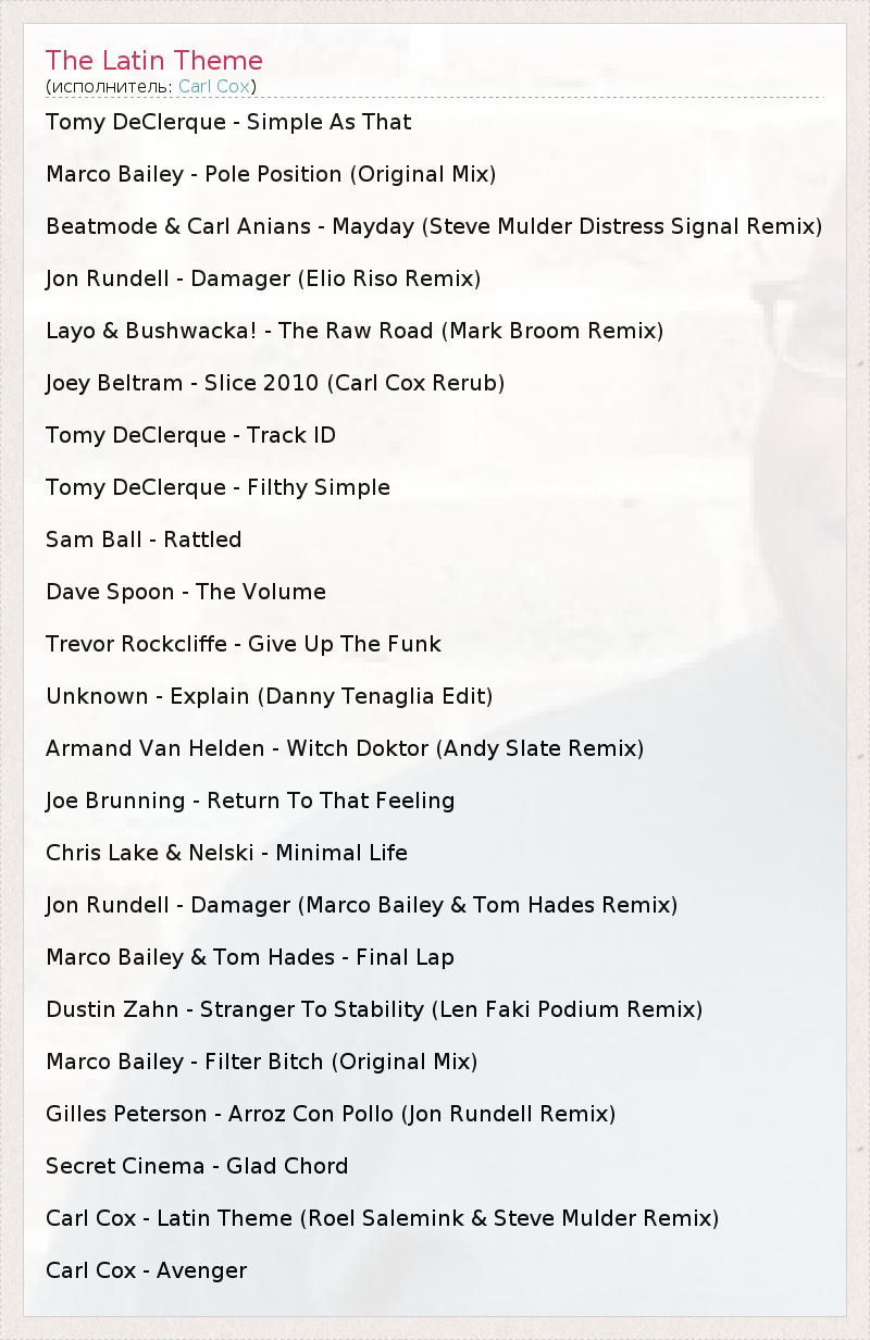 Tomy DeClerque - Simple As That Marco Bailey - Pole Position (Original Mix) Beatmode & Carl Anians - Mayday (Steve Mulder Distress Signal Remix) Jon Rundell - Damager (Elio Riso Remix) Layo & Bushwacka! - The Raw Road (Mark Broom Remix) Joey Beltram - Slice 2010 (Carl Cox Rerub) Tomy DeClerque - Track ID Tomy DeClerque - Filthy Simple Sam Ball - Rattled Dave Spoon - The Volume Trevor Rockcliffe - Give Up The Funk Unknown - Explain (Danny Tenaglia Edit) Armand Van Helden - Witch Doktor (Andy Slate Remix) Joe Brunning - Return To That Feeling Chris Lake & Nelski - Minimal Life Jon Rundell - Damager (Marco Bailey & Tom Hades Remix) Marco Bailey & Tom Hades - Final Lap Dustin Zahn - Stranger To Stability (Len Faki Podium Remix) Marco Bailey - Filter Bitch (Original Mix) Gilles Peterson - Arroz Con Pollo (Jon Rundell Remix) Secret Cinema - Glad Chord Carl Cox - Latin Theme (Roel Salemink & Steve Mulder Remix) Carl Cox - Avenger