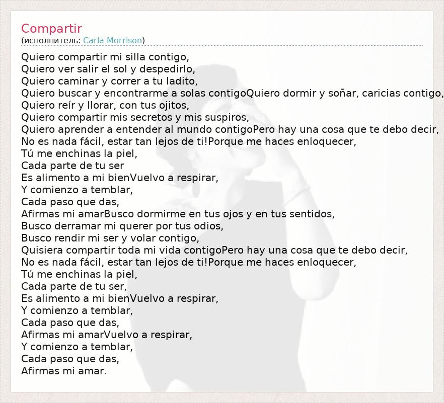 Quiero compartir mi silla contigo, Quiero ver salir el sol y despedirlo, Quiero caminar y correr a tu ladito, Quiero buscar y encontrarme a solas contigoQuiero dormir y soñar, caricias contigo, Quiero reír y llorar, con tus ojitos, Quiero compartir mis secretos y mis suspiros, Quiero aprender a entender al mundo contigoPero hay una cosa que te debo decir, No es nada fácil, estar tan lejos de ti!Porque me haces enloquecer, Tú me enchinas la piel, Cada parte de tu ser Es alimento a mi bienVuelvo a respirar, Y comienzo a temblar, Cada paso que das, Afirmas mi amarBusco dormirme en tus ojos y en tus sentidos, Busco derramar mi querer por tus odios, Busco rendir mi ser y volar contigo, Quisiera compartir toda mi vida contigoPero hay una cosa que te debo decir, No es nada fácil, estar tan lejos de ti!Porque me haces enloquecer, Tú me enchinas la piel, Cada parte de tu ser, Es alimento a mi bienVuelvo a respirar, Y comienzo a temblar, Cada paso que das, Afirmas mi amarVuelvo a respirar, Y comienzo a temblar, Cada paso que das, Afirmas mi amar.