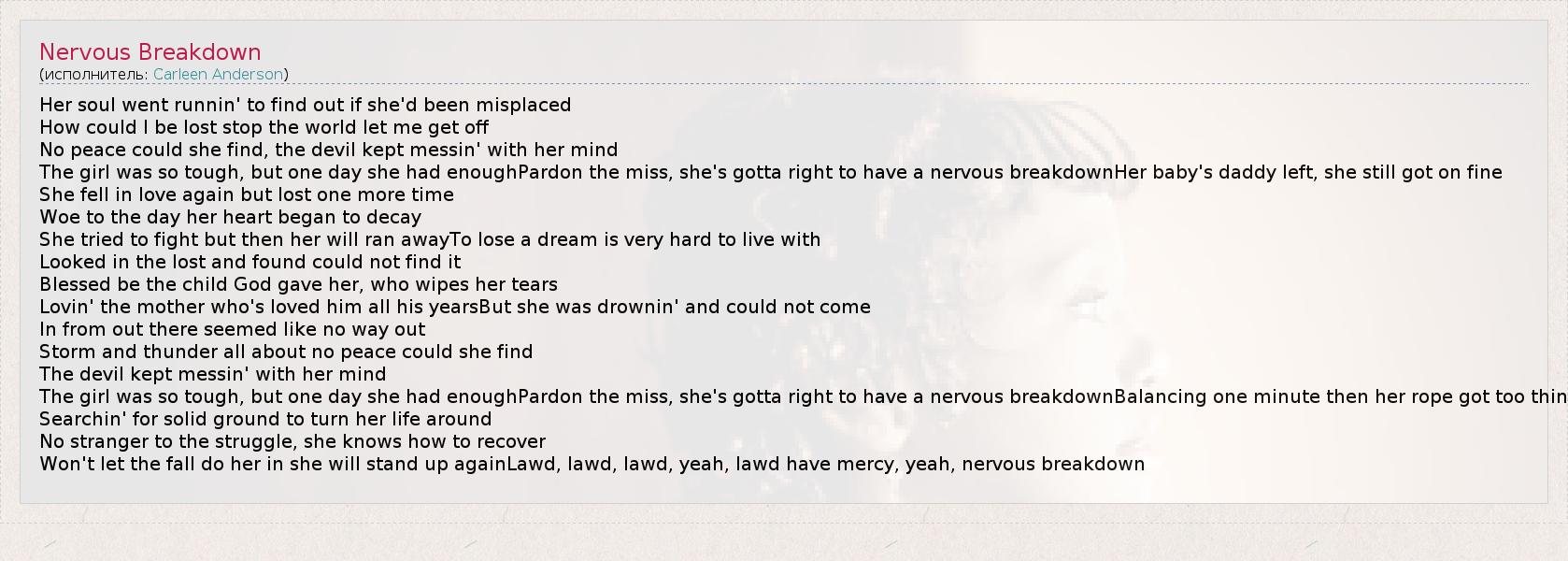 Won't let the fall do her in she will stand up againLawd, lawd, lawd, yeah, lawd have mercy, yeah, nervous breakdown