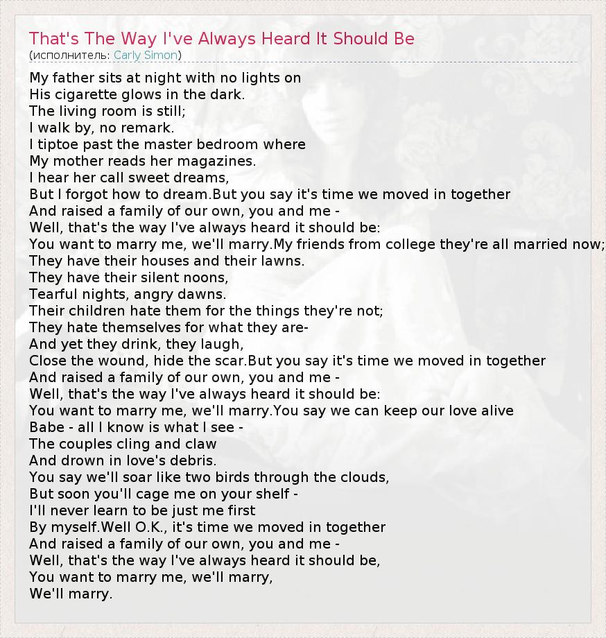 My father sits at night with no lights on His cigarette glows in the dark. The living room is still; I walk by, no remark. I tiptoe past the master bedroom where My mother reads her magazines. I hear her call sweet dreams, But I forgot how to dream.But you say it's time we moved in together And raised a family of our own, you and me - Well, that's the way I've always heard it should be: You want to marry me, we'll marry.My friends from college they're all married now; They have their houses and their lawns. They have their silent noons, Tearful nights, angry dawns. Their children hate them for the things they're not; They hate themselves for what they are- And yet they drink, they laugh, Close the wound, hide the scar.But you say it's time we moved in together And raised a family of our own, you and me - Well, that's the way I've always heard it should be: You want to marry me, we'll marry.You say we can keep our love alive Babe - all I know is what I see - The couples cling and claw And drown in love's debris. You say we'll soar like two birds through the clouds, But soon you'll cage me on your shelf - I'll never learn to be just me first By myself.Well O.K., it's time we moved in together And raised a family of our own, you and me - Well, that's the way I've always heard it should be, You want to marry me, we'll marry, We'll marry.