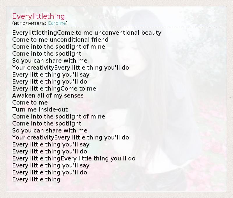 EverylittlethingCome to me unconventional beauty Come to me unconditional friend Come into the spotlight of mine Come into the spotlight So you can share with me Your creativityEvery little thing you'll do Every little thing you'll say Every little thing you'll do Every little thingCome to me Awaken all of my senses Come to me Turn me inside-out Come into the spotlight of mine Come into the spotlight So you can share with me Your creativityEvery little thing you'll do Every little thing you'll say Every little thing you'll do Every little thingEvery little thing you'll do Every little thing you'll say Every little thing you'll do Every little thing