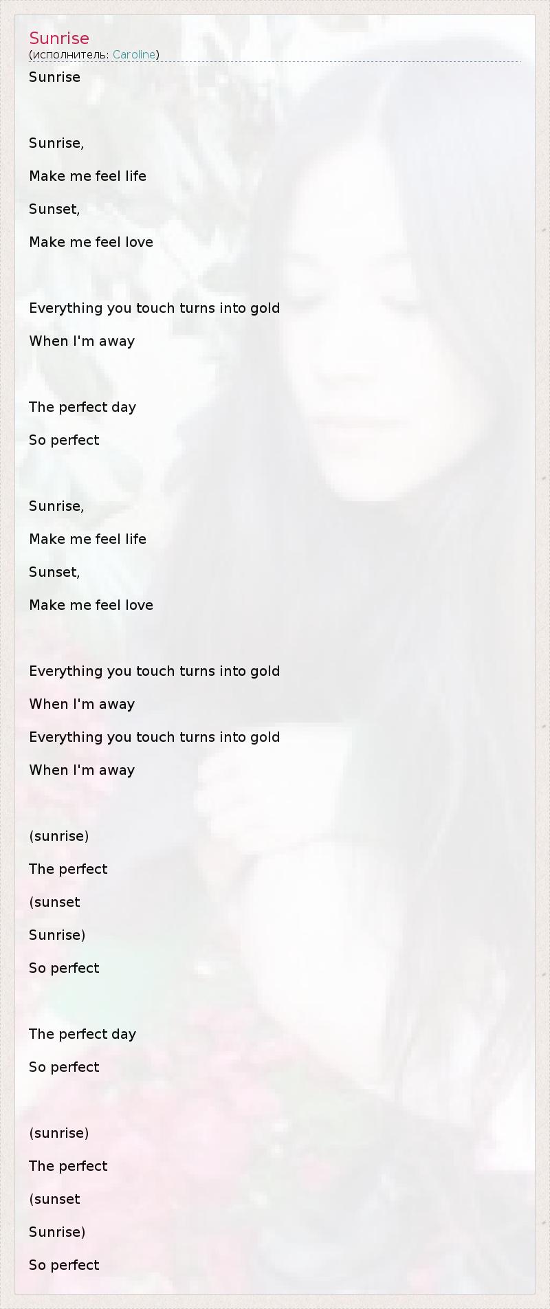Sunrise Sunrise, Make me feel life Sunset, Make me feel love Everything you touch turns into gold When I'm away The perfect day So perfect Sunrise, Make me feel life Sunset, Make me feel love Everything you touch turns into gold When I'm away Everything you touch turns into gold When I'm away (sunrise) The perfect (sunset Sunrise) So perfect The perfect day So perfect (sunrise) The perfect (sunset Sunrise) So perfect