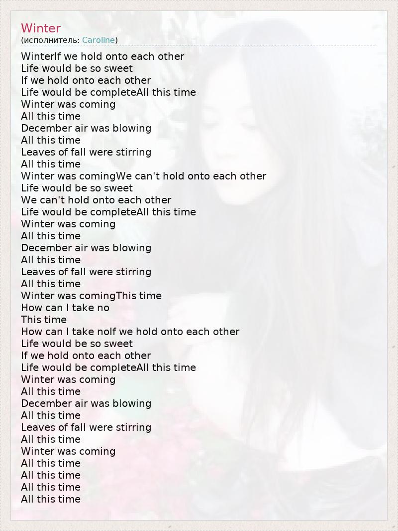 WinterIf we hold onto each other Life would be so sweet If we hold onto each other Life would be completeAll this time Winter was coming All this time December air was blowing All this time Leaves of fall were stirring All this time Winter was comingWe can't hold onto each other Life would be so sweet We can't hold onto each other Life would be completeAll this time Winter was coming All this time December air was blowing All this time Leaves of fall were stirring All this time Winter was comingThis time How can I take no This time How can I take noIf we hold onto each other Life would be so sweet If we hold onto each other Life would be completeAll this time Winter was coming All this time December air was blowing All this time Leaves of fall were stirring All this time Winter was coming All this time All this time All this time All this time