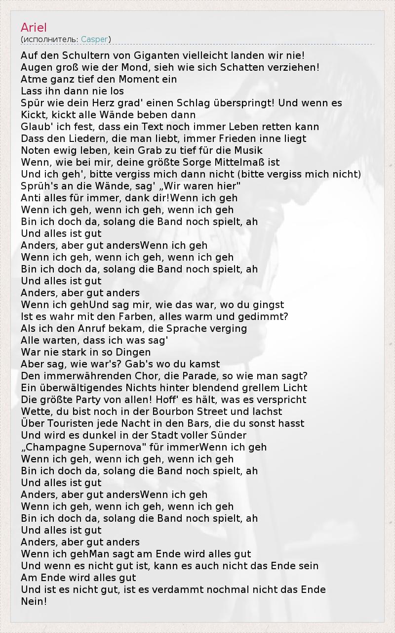 Это интересно:Бенджамин Гриффи, более известный как «Casper», - немецкий рэппер из Билефельда. Каспер начал писать стихи, ещё будучи ребёнком, когда жил в Августе, штат Джорджия. Позже его мать решает переехать в Германию. После этого Каспер сосредоточился на металкор-группе в течение двух лет, "A Fear Called Treason".Через некоторое время ( в 2006 году) записал хип-хоп диск "Die Welt Hort Mich". 9 мая 2008 года, Каспер... продолжение