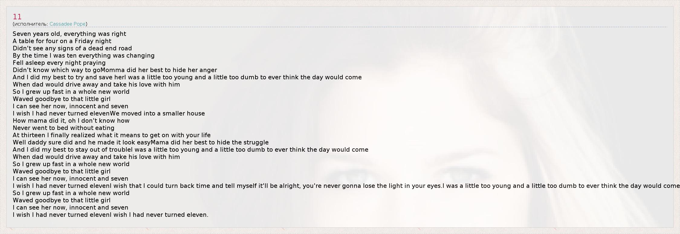 I wish I had never turned elevenI wish that I could turn back time and tell myself it'll be alright, you're never gonna lose the light in your eyes.I was a little too young and a little too dumb to ever think the day would come