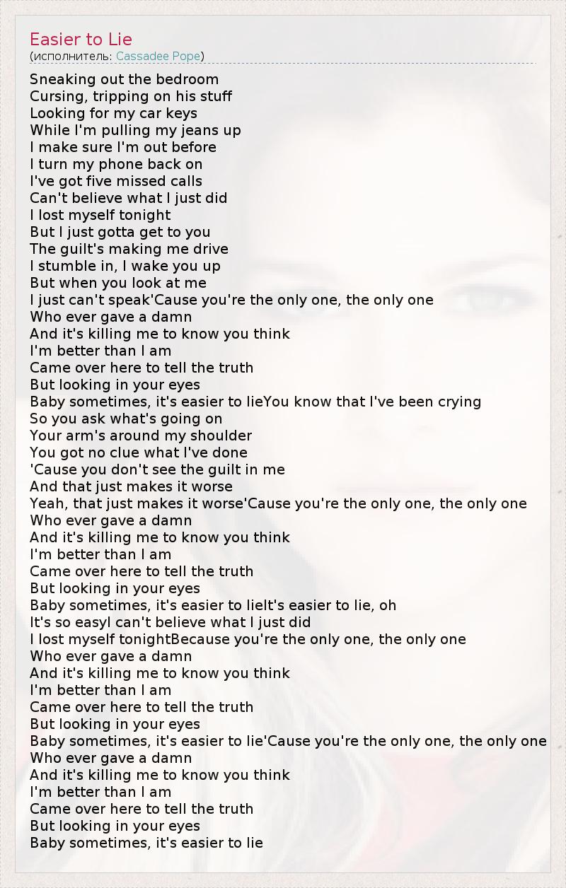 Sneaking out the bedroom Cursing, tripping on his stuff Looking for my car keys While I'm pulling my jeans up I make sure I'm out before I turn my phone back on I've got five missed calls Can't believe what I just did I lost myself tonight But I just gotta get to you The guilt's making me drive I stumble in, I wake you up But when you look at me I just can't speak'Cause you're the only one, the only one Who ever gave a damn And it's killing me to know you think I'm better than I am Came over here to tell the truth But looking in your eyes Baby sometimes, it's easier to lieYou know that I've been crying So you ask what's going on Your arm's around my shoulder You got no clue what I've done 'Cause you don't see the guilt in me And that just makes it worse Yeah, that just makes it worse'Cause you're the only one, the only one Who ever gave a damn And it's killing me to know you think I'm better than I am Came over here to tell the truth But looking in your eyes Baby sometimes, it's easier to lieIt's easier to lie, oh It's so easyI can't believe what I just did I lost myself tonightBecause you're the only one, the only one Who ever gave a damn And it's killing me to know you think I'm better than I am Came over here to tell the truth But looking in your eyes Baby sometimes, it's easier to lie'Cause you're the only one, the only one Who ever gave a damn And it's killing me to know you think I'm better than I am Came over here to tell the truth But looking in your eyes Baby sometimes, it's easier to lie