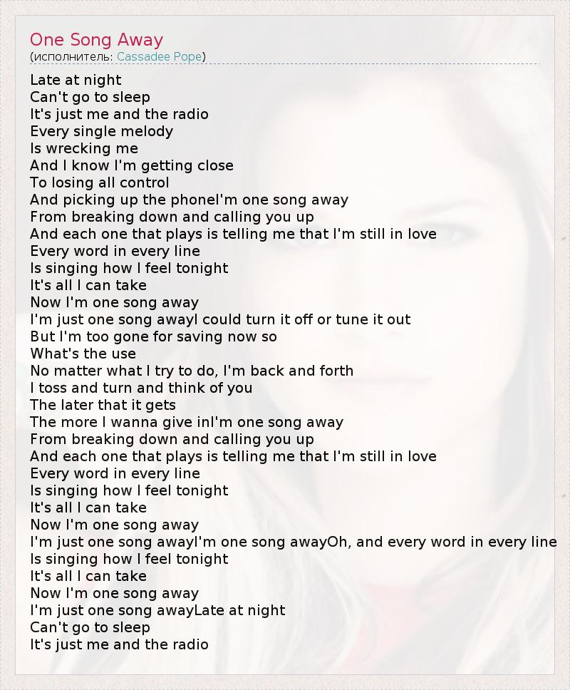 Late at night Can't go to sleep It's just me and the radio Every single melody Is wrecking me And I know I'm getting close To losing all control And picking up the phoneI'm one song away From breaking down and calling you up And each one that plays is telling me that I'm still in love Every word in every line Is singing how I feel tonight It's all I can take Now I'm one song away I'm just one song awayI could turn it off or tune it out But I'm too gone for saving now so What's the use No matter what I try to do, I'm back and forth I toss and turn and think of you The later that it gets The more I wanna give inI'm one song away From breaking down and calling you up And each one that plays is telling me that I'm still in love Every word in every line Is singing how I feel tonight It's all I can take Now I'm one song away I'm just one song awayI'm one song awayOh, and every word in every line Is singing how I feel tonight It's all I can take Now I'm one song away I'm just one song awayLate at night Can't go to sleep It's just me and the radio