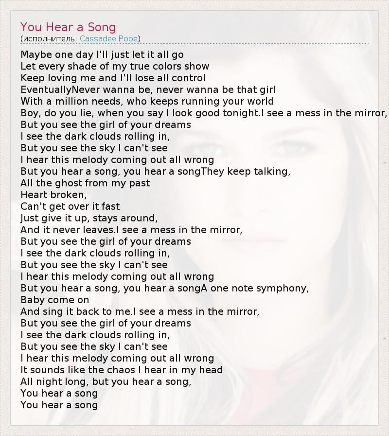 Maybe one day I'll just let it all go Let every shade of my true colors show Keep loving me and I'll lose all control EventuallyNever wanna be, never wanna be that girl With a million needs, who keeps running your world Boy, do you lie, when you say I look good tonight.I see a mess in the mirror, But you see the girl of your dreams I see the dark clouds rolling in, But you see the sky I can't see I hear this melody coming out all wrong But you hear a song, you hear a songThey keep talking, All the ghost from my past Heart broken, Can't get over it fast Just give it up, stays around, And it never leaves.I see a mess in the mirror, But you see the girl of your dreams I see the dark clouds rolling in, But you see the sky I can't see I hear this melody coming out all wrong But you hear a song, you hear a songA one note symphony, Baby come on And sing it back to me.I see a mess in the mirror, But you see the girl of your dreams I see the dark clouds rolling in, But you see the sky I can't see I hear this melody coming out all wrong It sounds like the chaos I hear in my head All night long, but you hear a song, You hear a song You hear a song