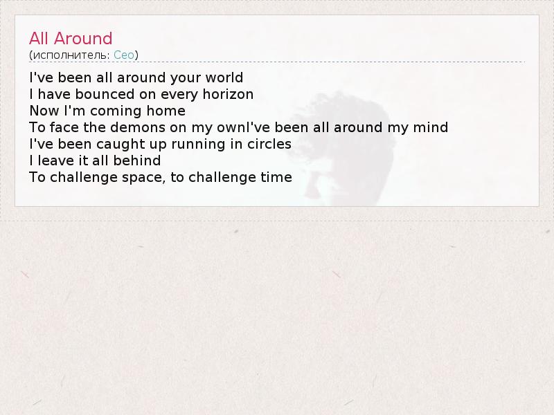 I've been all around your world I have bounced on every horizon Now I'm coming home To face the demons on my ownI've been all around my mind I've been caught up running in circles I leave it all behind To challenge space, to challenge time